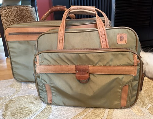 Discover a rare find-a 6-compartment carry-on luggage bag in a unique light olive-green nylon with genuine tan leather accents and trim.