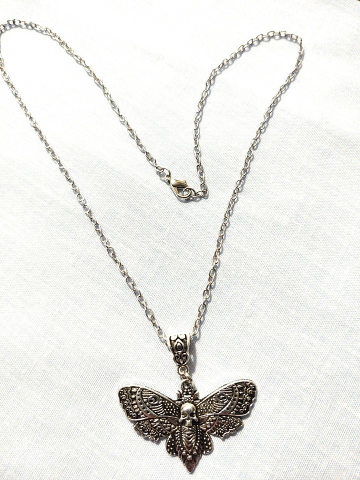 MOTH / BUTTERFLY WINGS WITH SKULL HEAD ON BODY SILVER ALLOY METAL PENDANT with DECO BAIL ON CHAIN LINK NECKLACE 18 - 19 INCHES LONG AND A LOBSTER CLAW CLASP