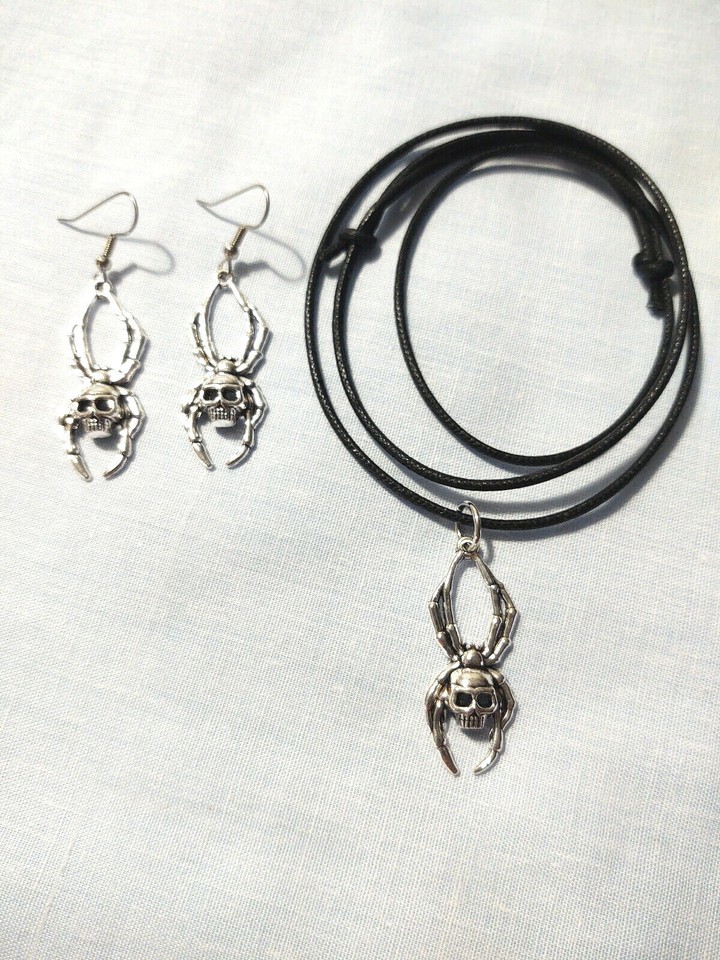 HUGE SPIDER / ARACHNID WITH HUMAN CRANIUM SKULL BODY EARRINGS AND NECKLACE SET