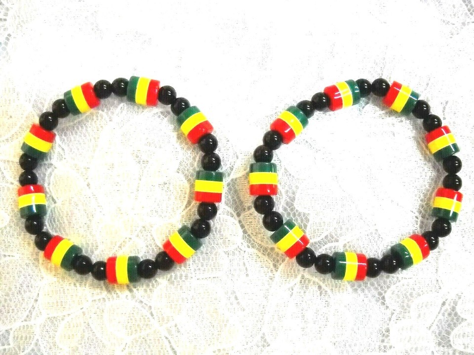 Set of 2 Rasta Red Yellow Green Acrylic Tube Beads on Stretch Elastic Bracelets
