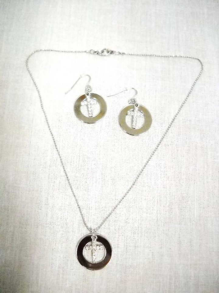 IT IS A SILVER TONE ROUND DONUT SHAPED PENDANT WITH A CRYSTAL CROSS IN FRONT MATCHING FRENCH HOOK PIERCED EARRINGS