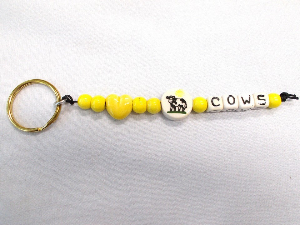 CERAMIC BEADED YELLOW HEART & COW IN THE SUN DISC w COWS TEXT KEY CHAIN KEY RING