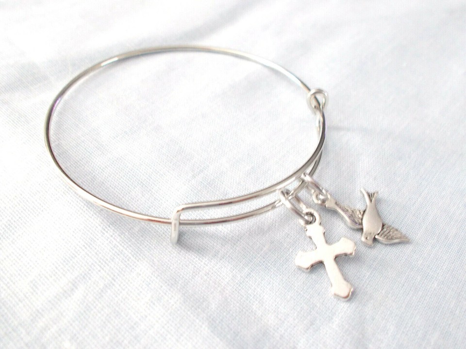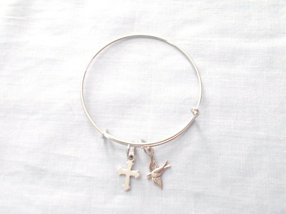 NEW DOUBLE CHARM CROSS & DOVE CHARMS ON SILVER ADJUSTABLE BANGLE BRACELET