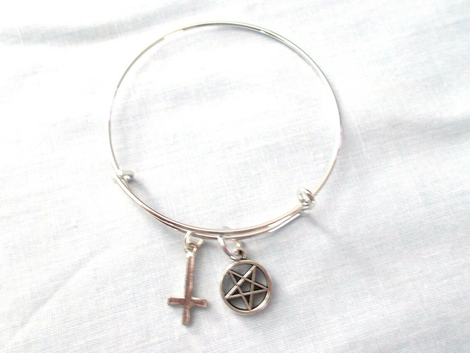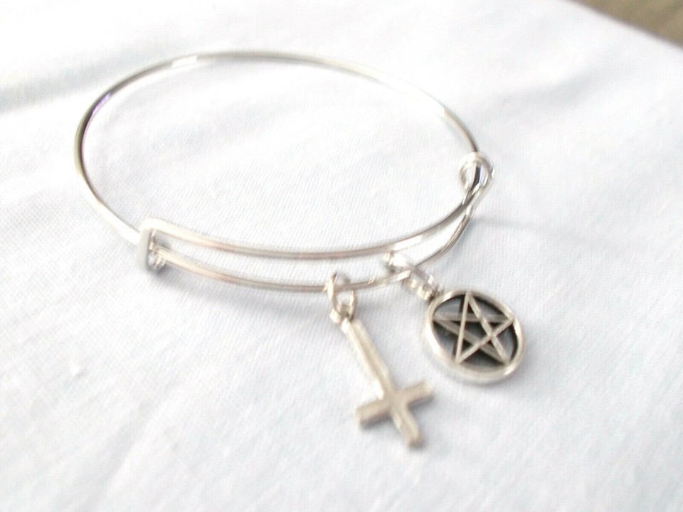 Satanic Inverted Cross and Pentagram Star Charms On 8" Silver Bangle Bracelet