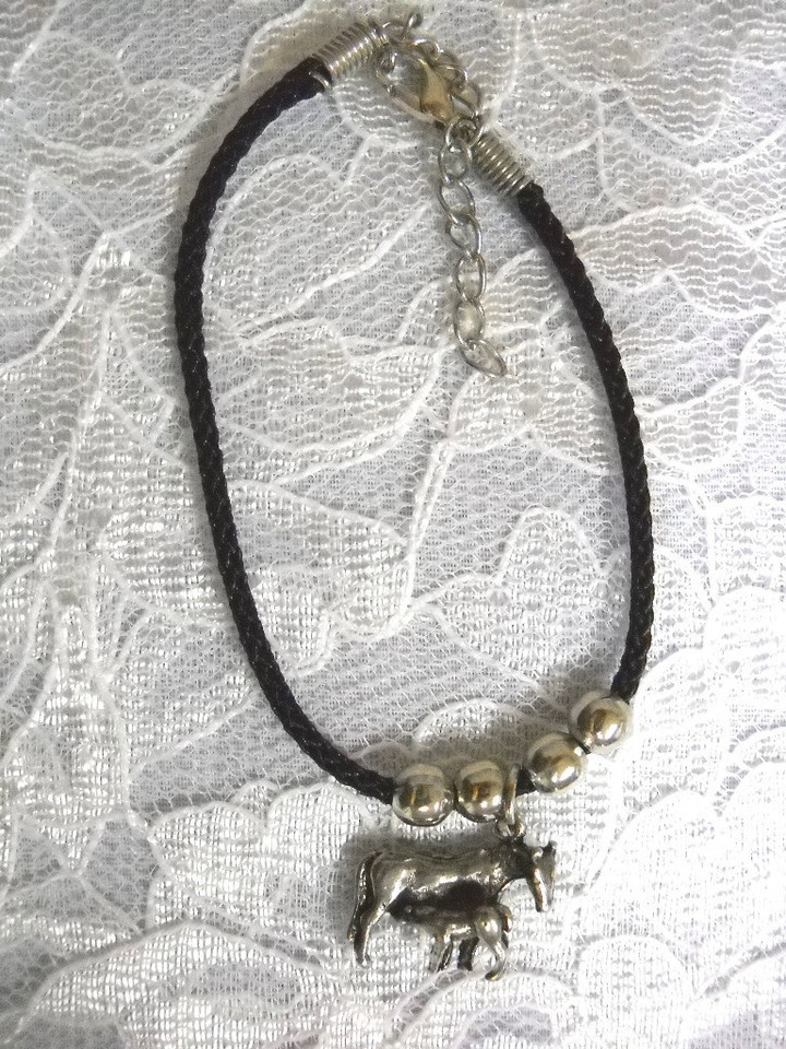 BLACK CORD w BEADS & 3D PEWTER MARE HORSE & NURSING COLT ANIMAL CHARM BRACELET