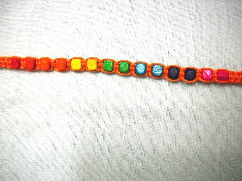 FUN ORANGE MACRAME w RAINBOW WOOD BEADS BLUE GREEN RED TIE ON BRACELET OR ANKLET
