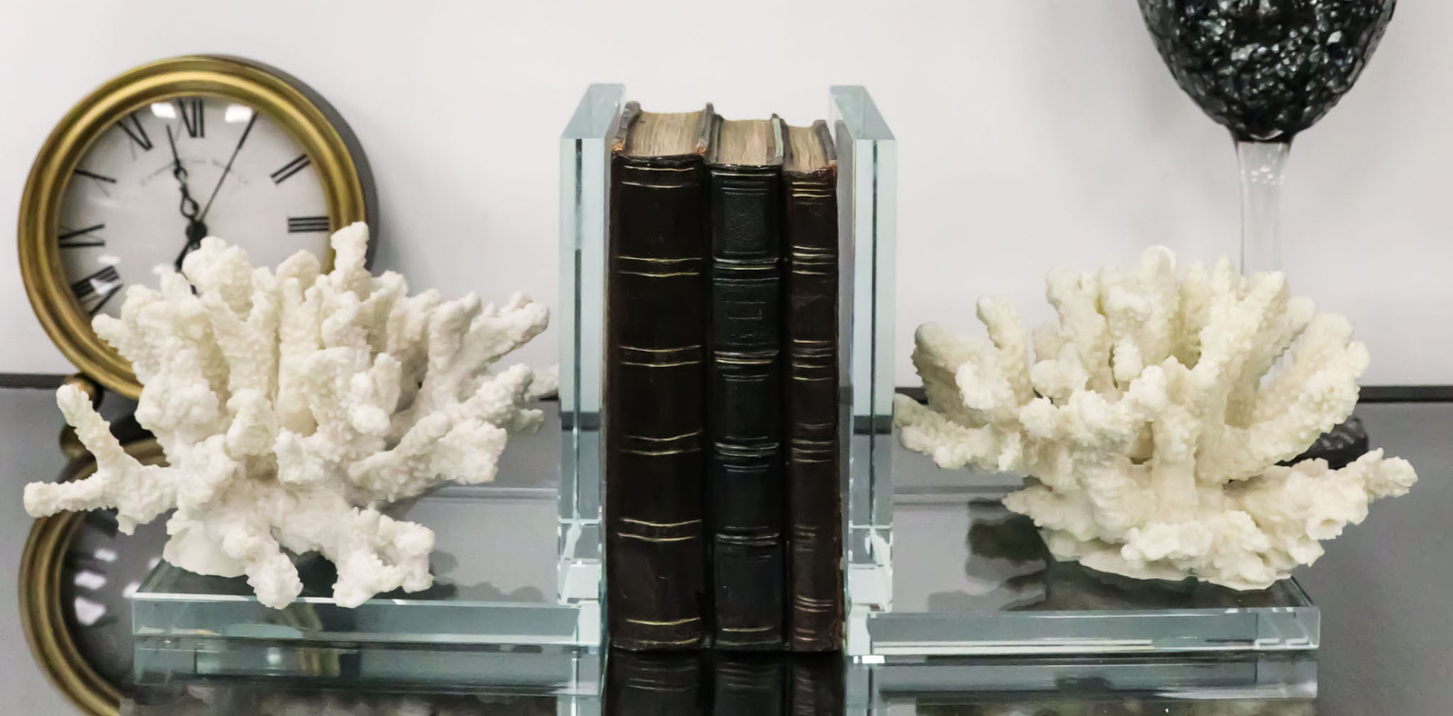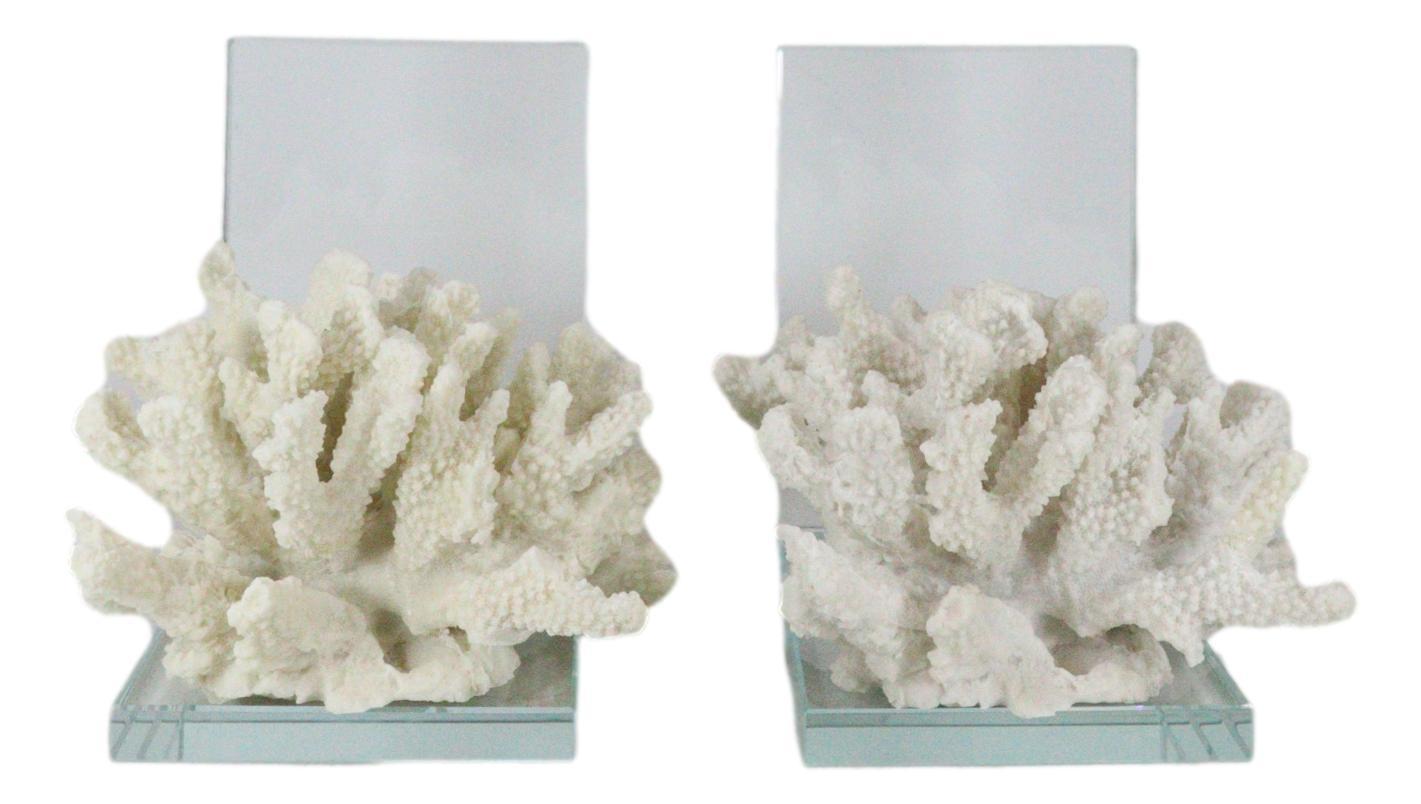 ? Bring seaside style to your shelving or desks with the delightful vintage charm and timeless off-white hues of these realistic finger coral bookends. Beautifully set on acrylic glass backing, each bookend will hold favorite books.