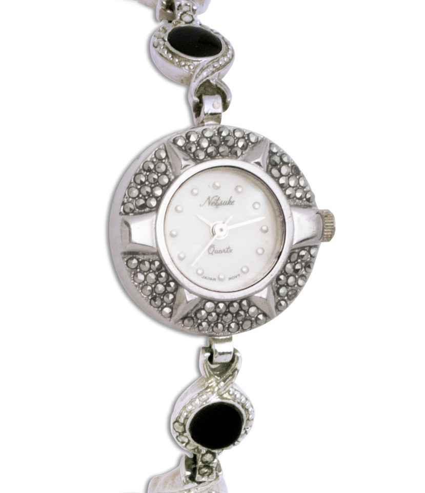 Case: round, Round dial, white dial, Marcasite bezel, Stainless steel Back, clasp stainless steel, Silver hands, inscribed dial: Netsuke, Japan Movt