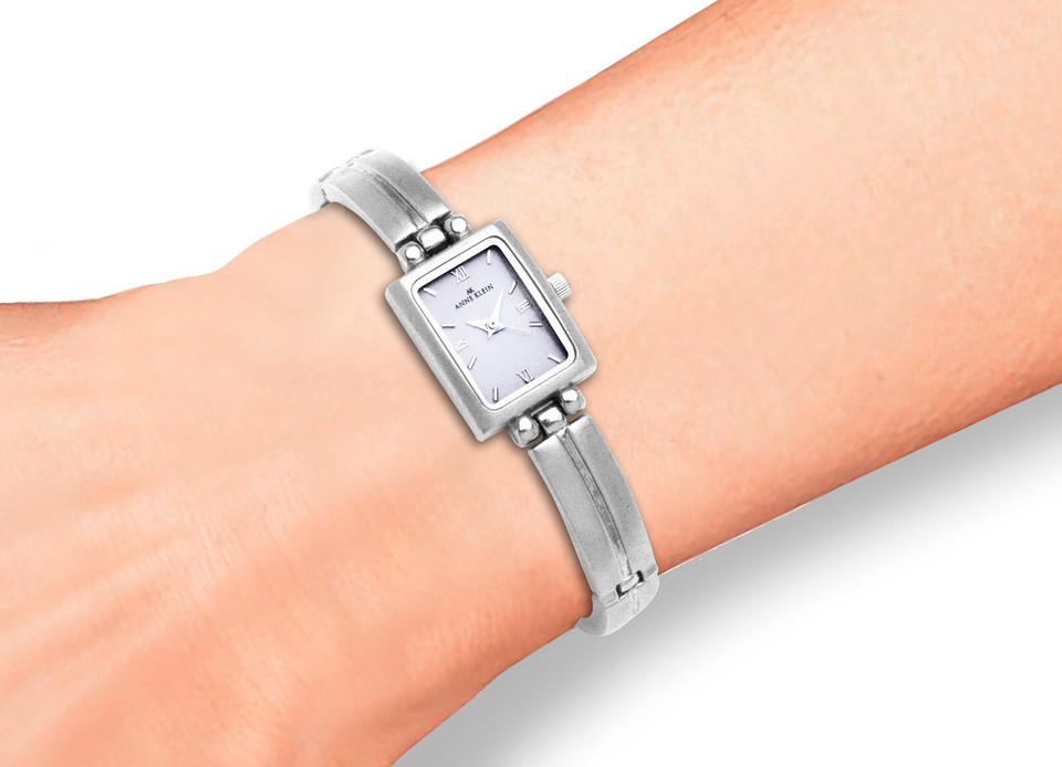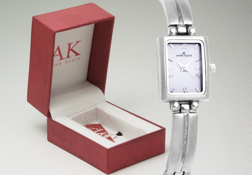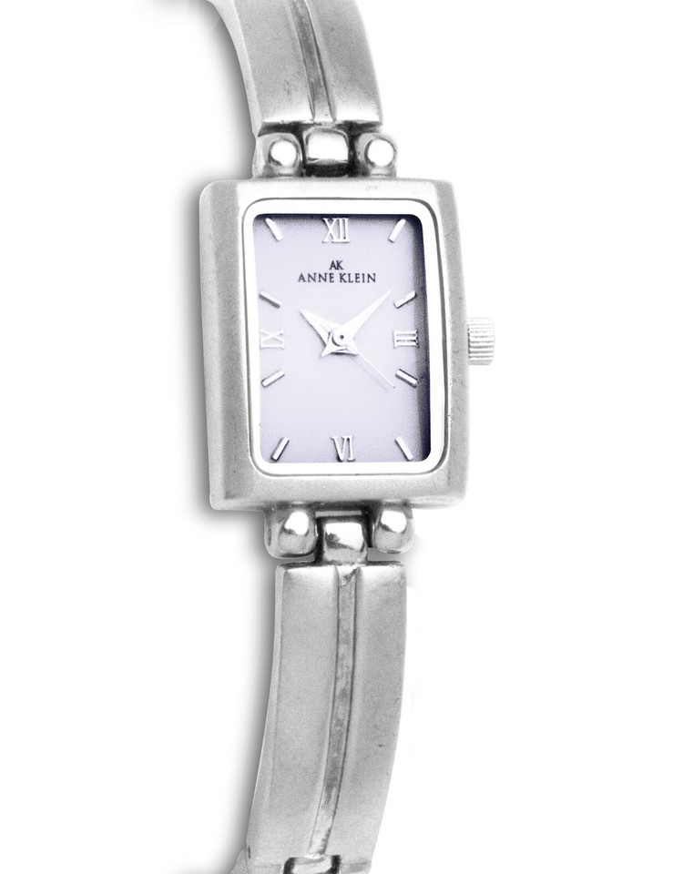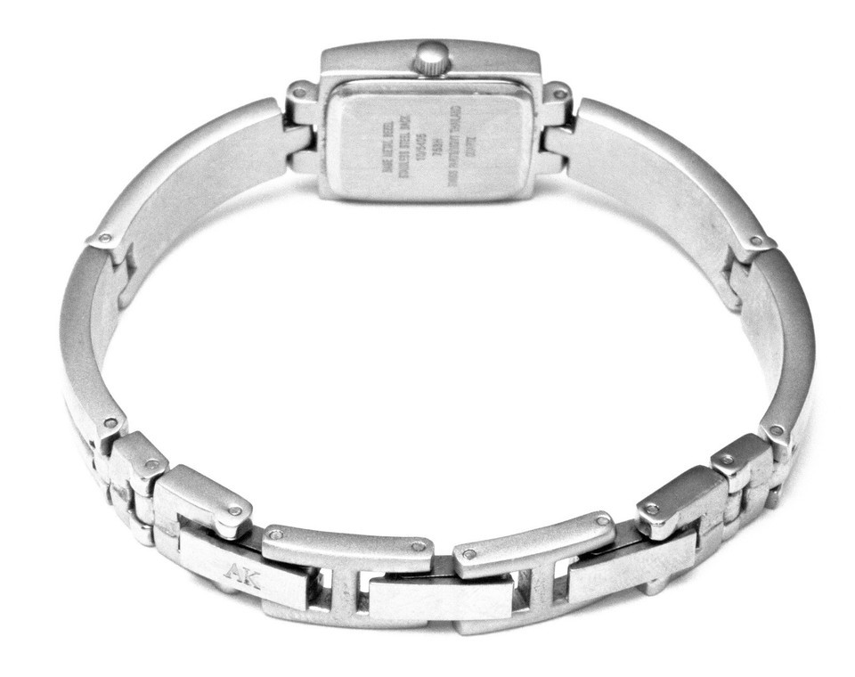Case: Rectangular silver, white dial, silver case, silver indices numbers, silver hands, inscribed Anne Klein
