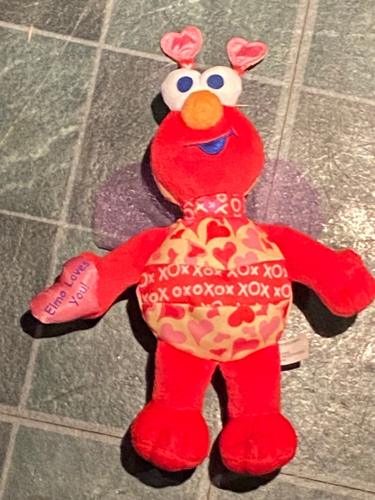 His body has XO's all over with red and pink hearts. Elmo has two heart shaped antenna at the top of his head and two wings on his back.
