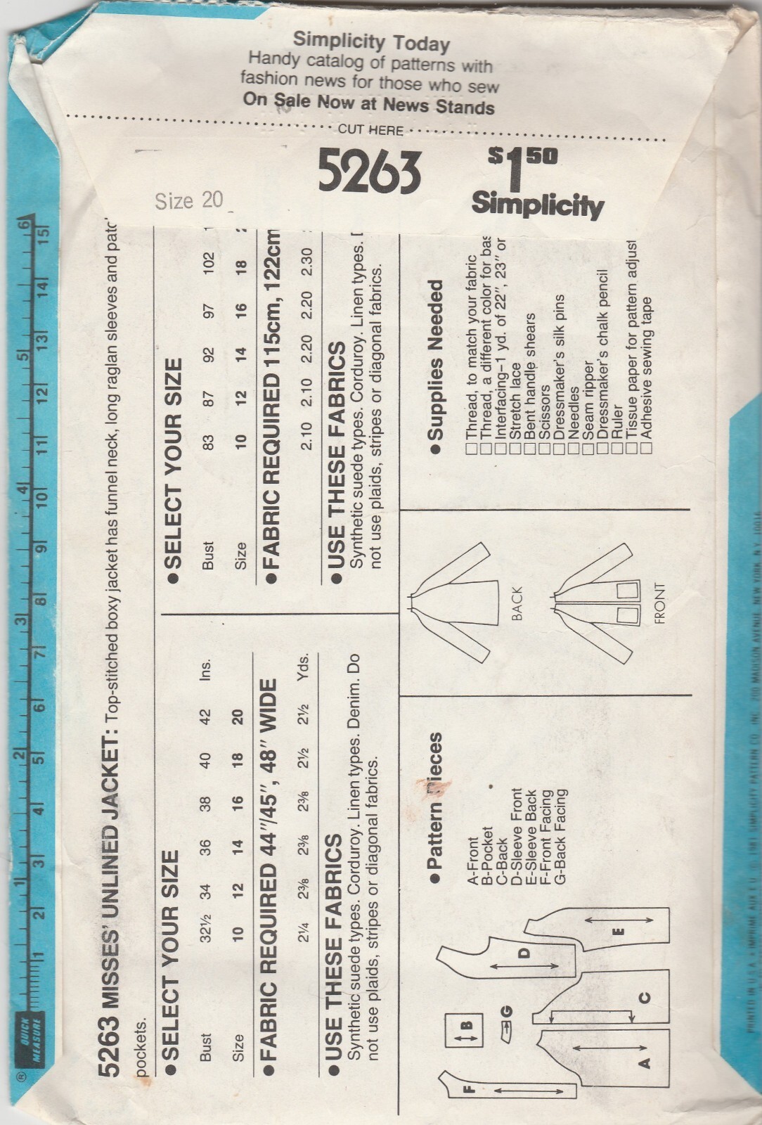 Simplicity Pattern Beginners Choice 5263 Level 3 ~ Size 20 Misses Unlined Jacket
