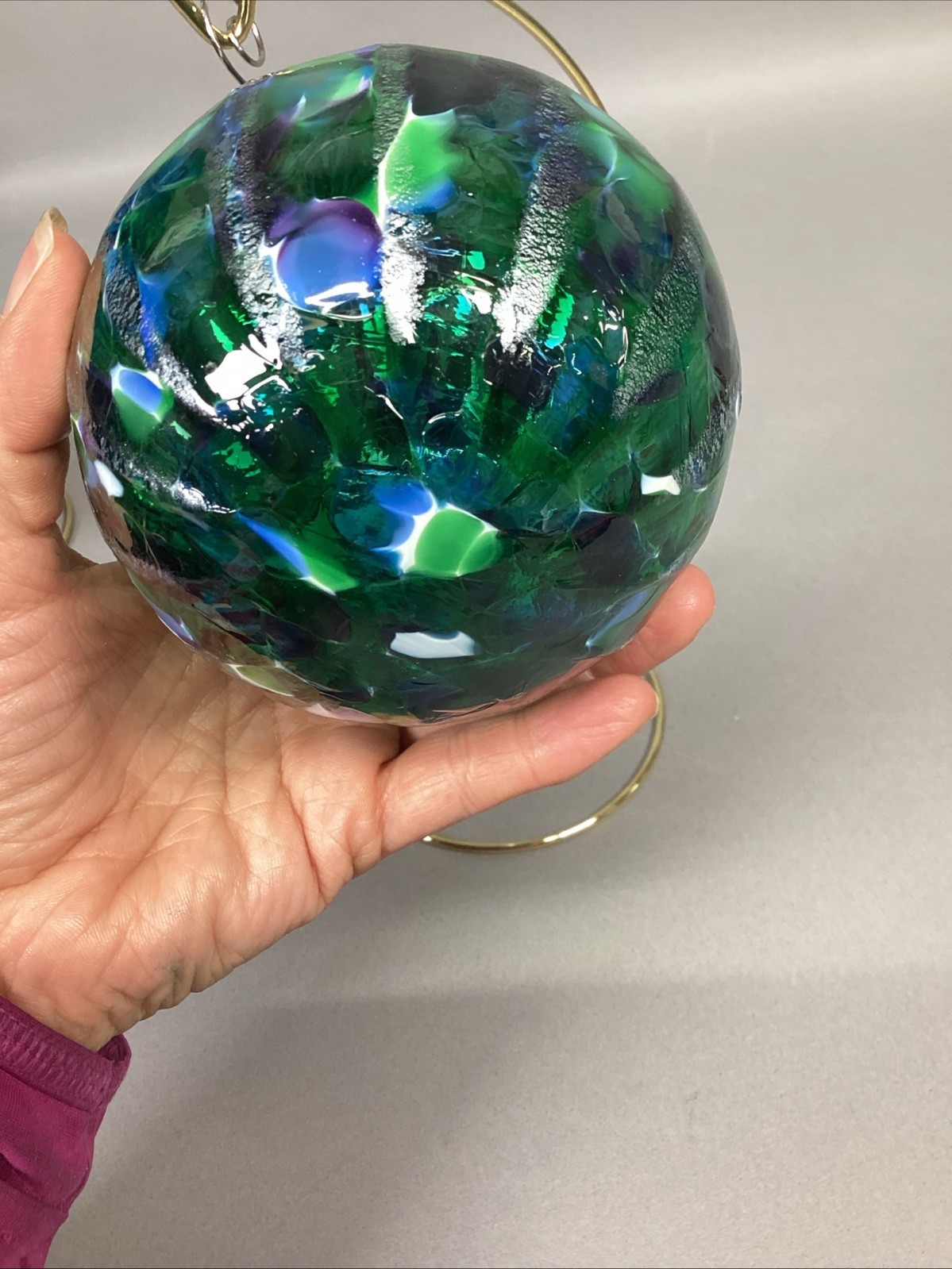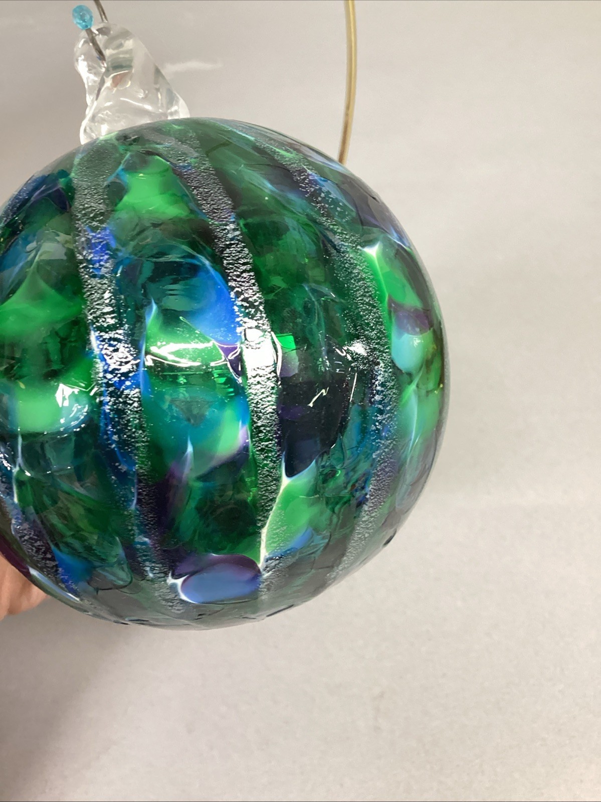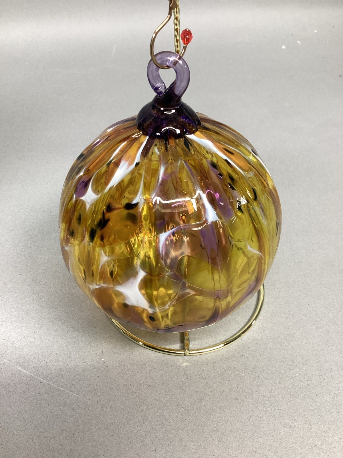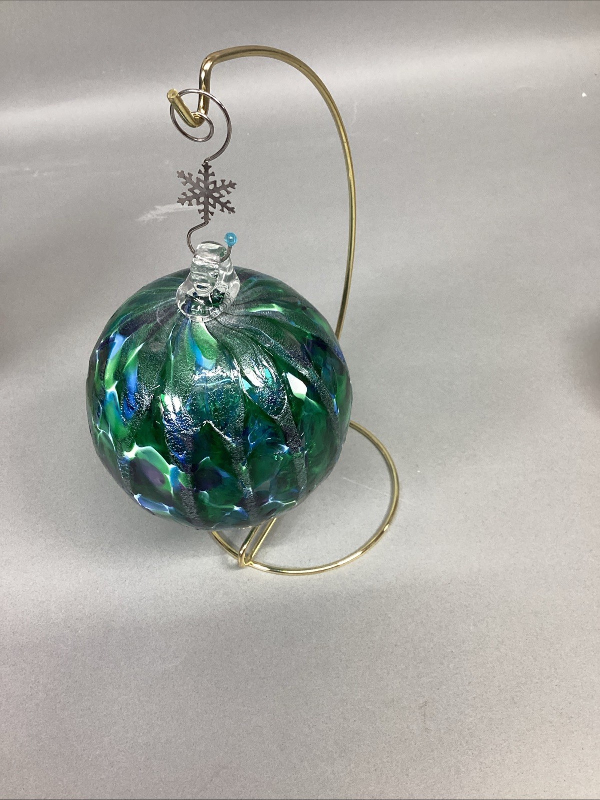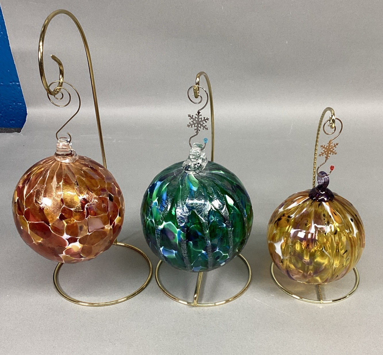 Set Of 3 Hand Blown Glass Christmas Ornaments With Ornament Hangers. These are in good condition. The green one measures 4.25?D (not including the topper). The orange red and yellow one is 4?D and the yellow one is 3.25?D. Measurements are approximate. The 3 ornament hangers heights are: 10.5?, 9? and 8?.