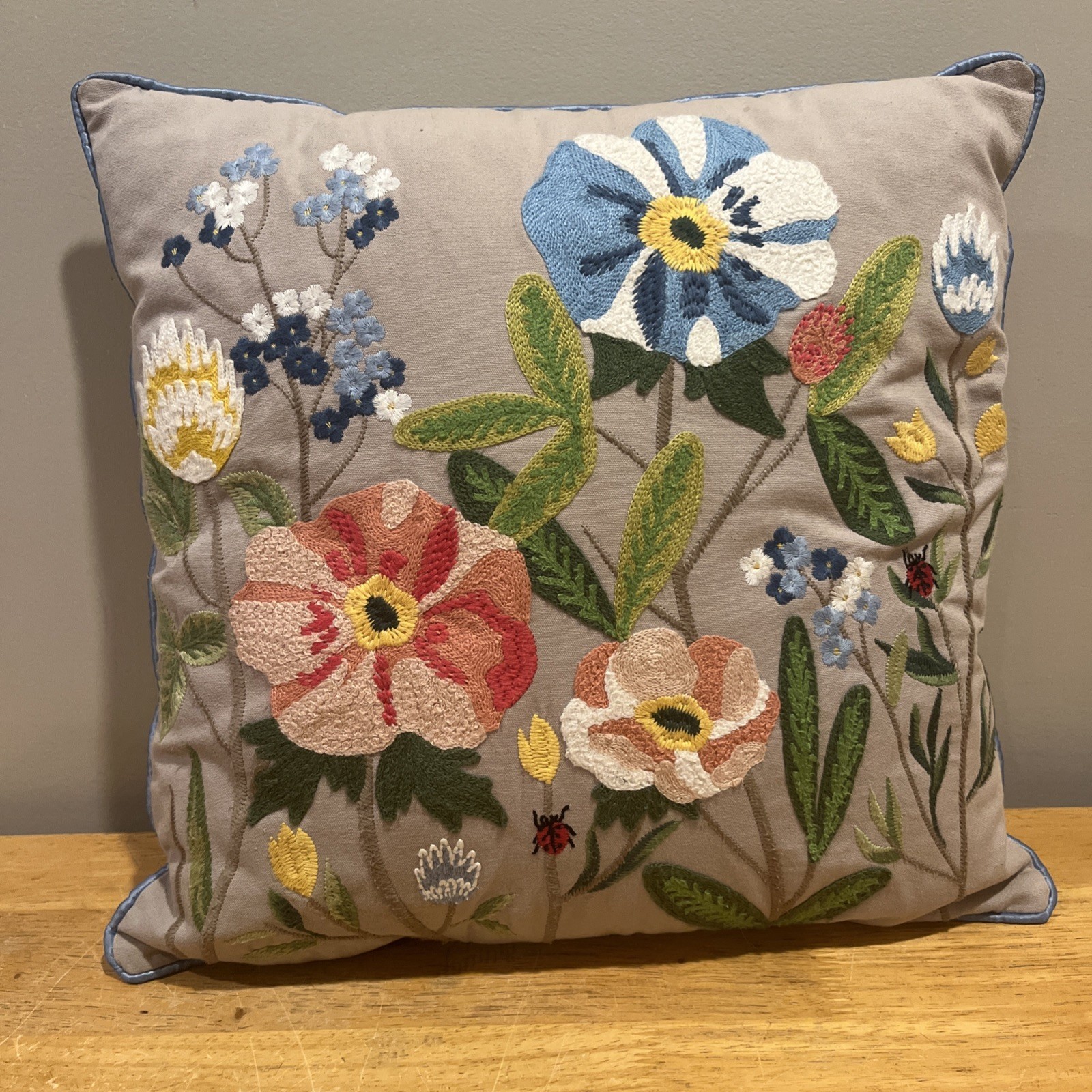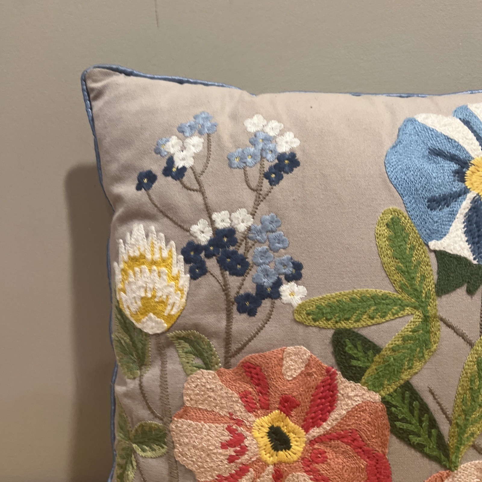 Pier One Pillow Embroidered Flowers Blue Decorative 17x17" Spring Cottage Core