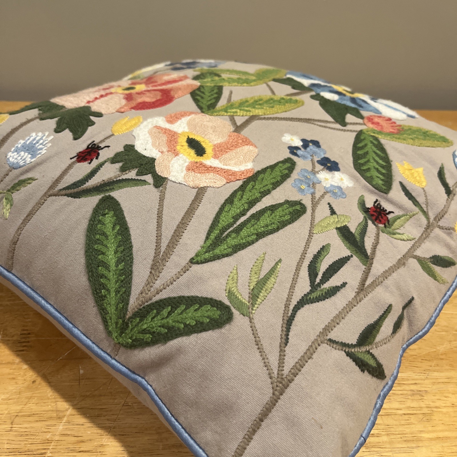 Pier One Pillow Embroidered Flowers Blue Decorative 17x17" Spring Cottage Core. Condition is Pre-owned. Shipped with Standard Shipping.