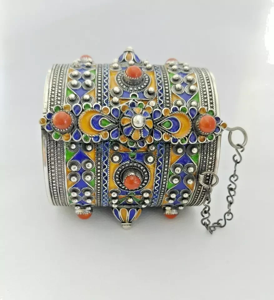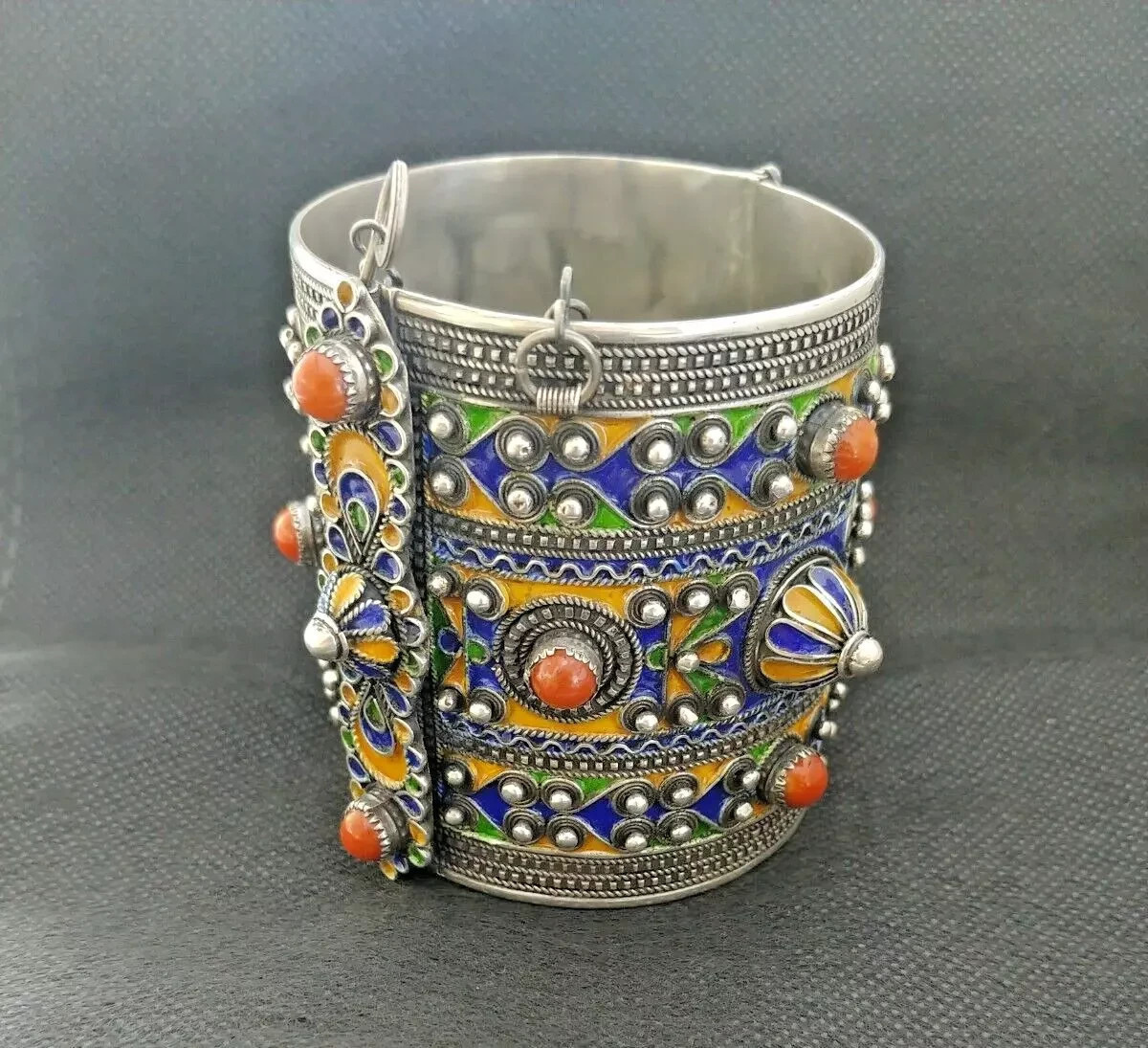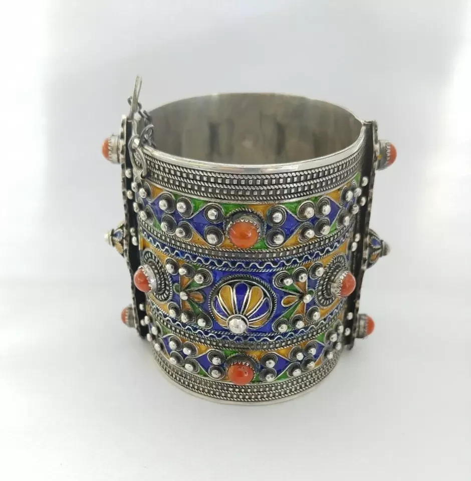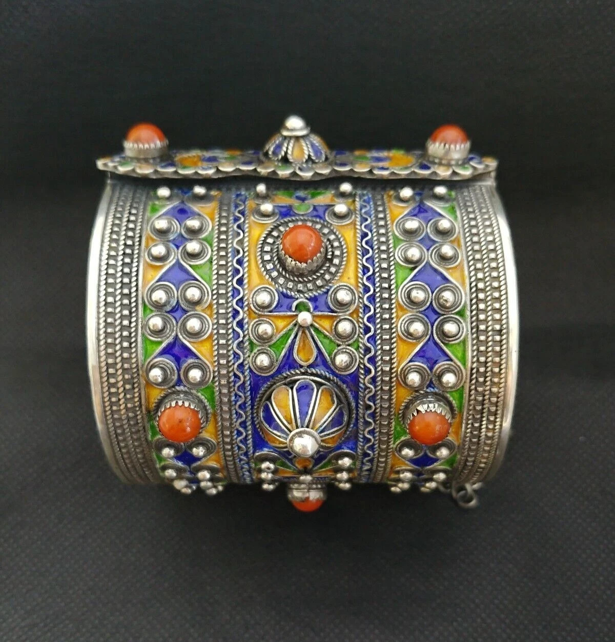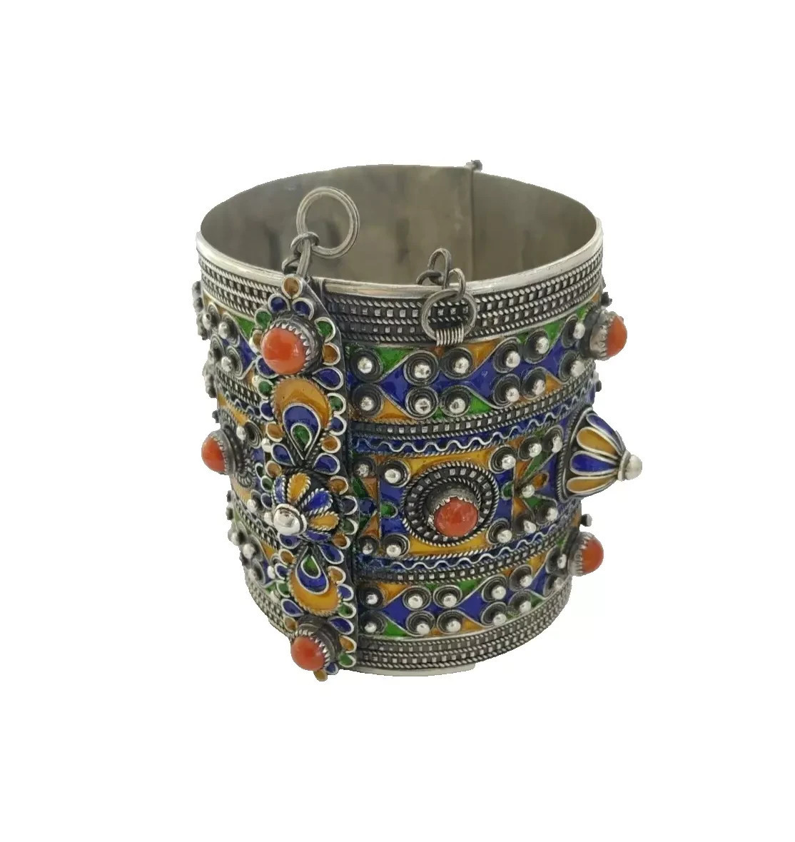 Silver Large Bracelet Berber Antique Tribal Ethnic Enamel and coral
