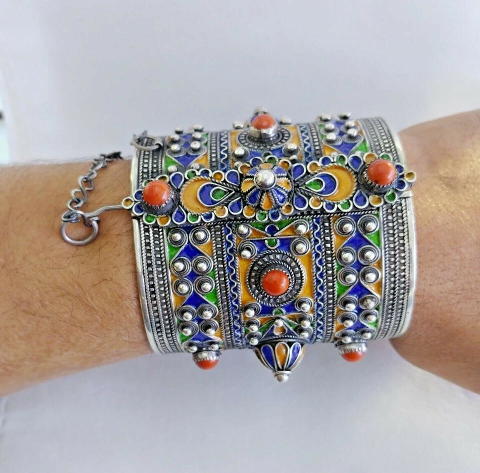 Berber Bracelet Kabyle Cuff Silver Large Enamel Coral Vintage Tribal Algerian