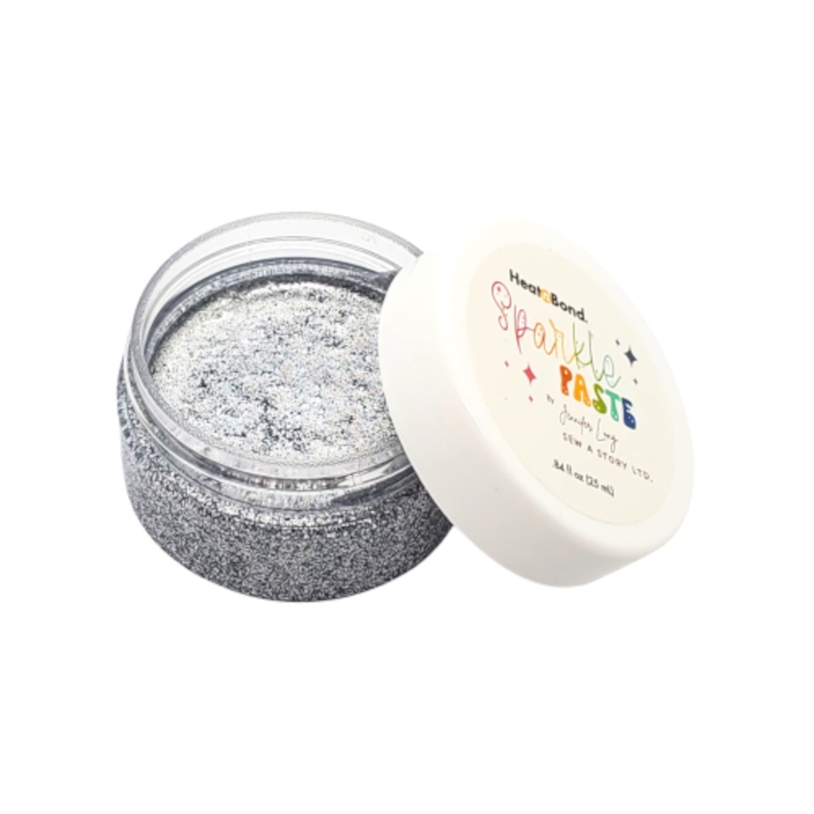 HeatnBond Silver Color Sparkle Paste By Jennifer Long Sew a Story 19148. Sparkle Paste is a heat-activated adhesive that adds a layer of glitter and shine to fabrics. Whether you are working on quilts, garments or home decor, Sparkle Paste brings a fun, radiant touch without the mess of traditional glitter. Available in 14 glittery, glistening shades, Sparkle Paste can be applied with a paintbrush to create freehand designs or with a small palette knife to create precise stenciled details. Each jar contains .84 fl. oz of Sparkle Paste. Color: Silver. CHK-SP-19148