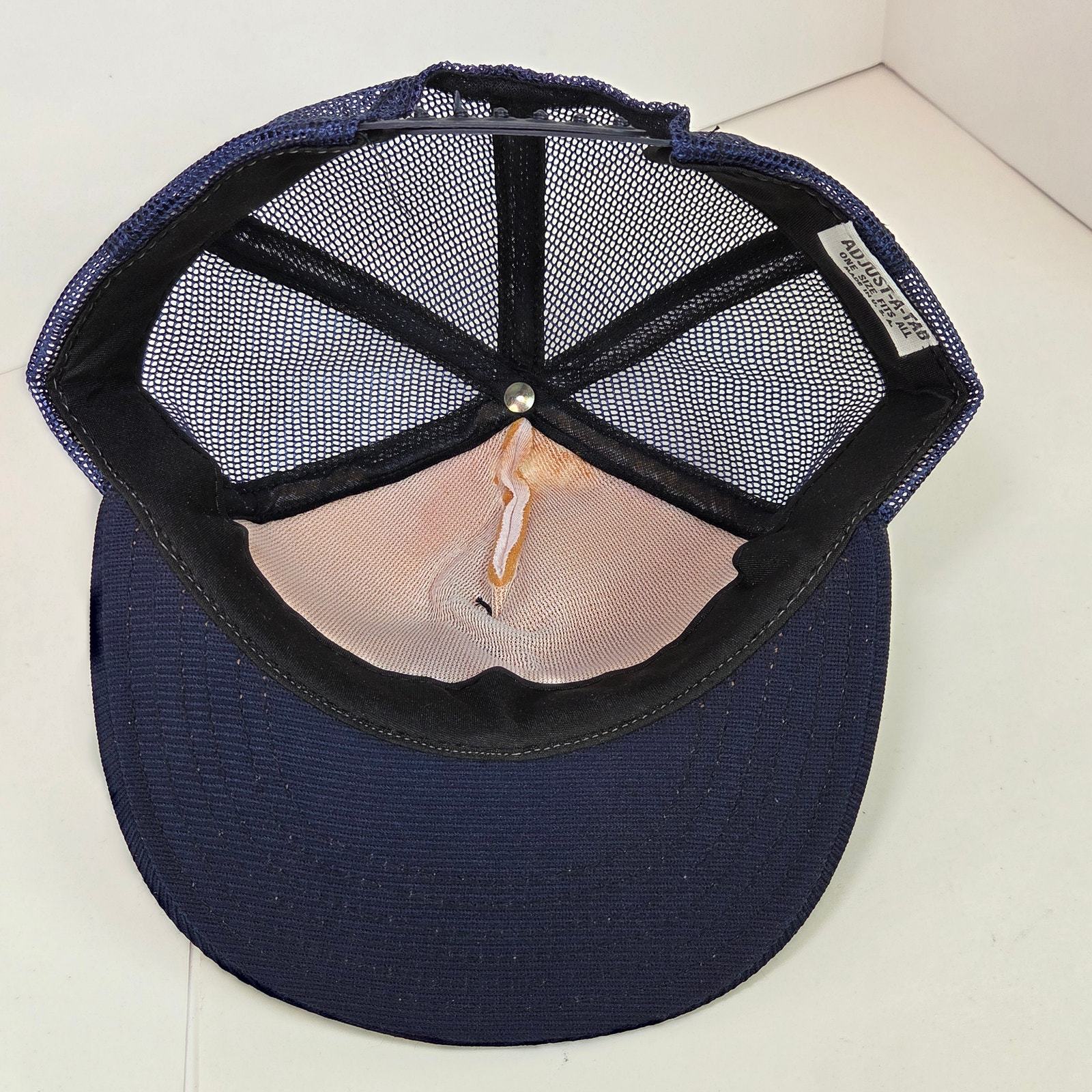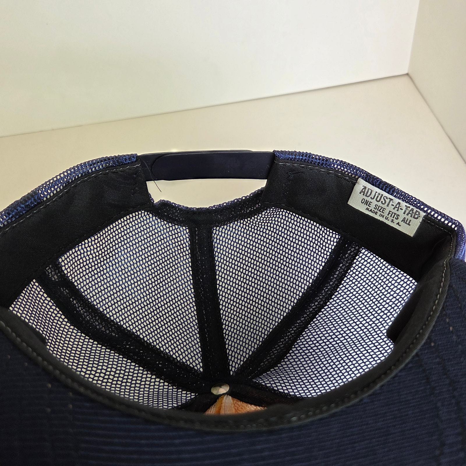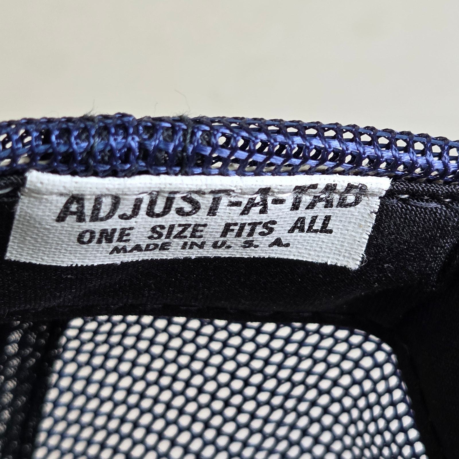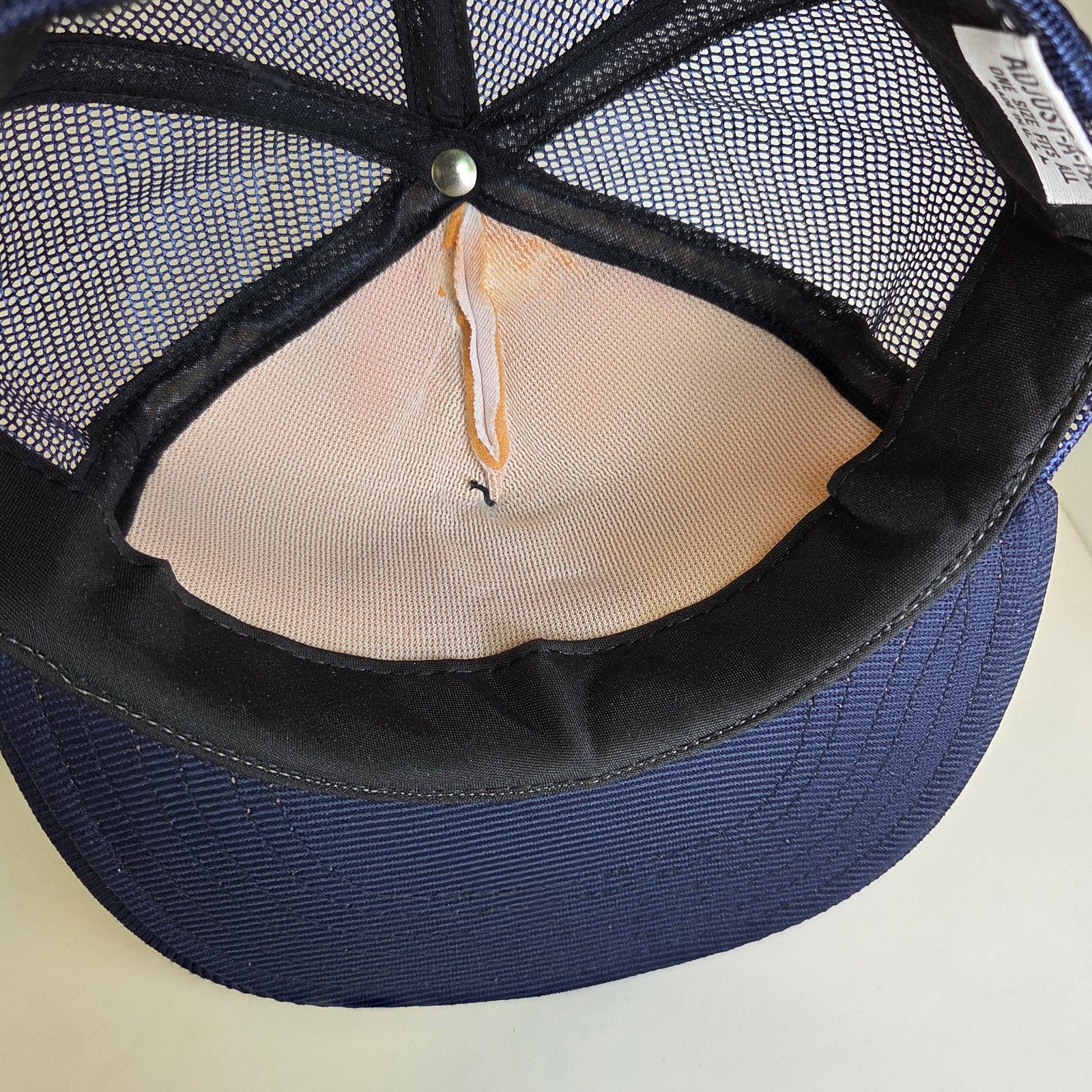 Authentic vintage Broken Arrow Resort trucker hat with a bold fishing graphic on the foam front. Features a navy mesh back with snap closure and a green underbrim. Classic Adjust-A-Tab, Made in USA label. Foam has begun to deteriorate (foam rot), and there is some discoloration inside and on the crown, consistent with age. Still holds display shape well and makes a great collectible piece for fishing or resort memorabilia collectors.