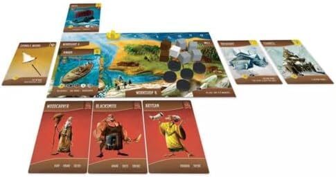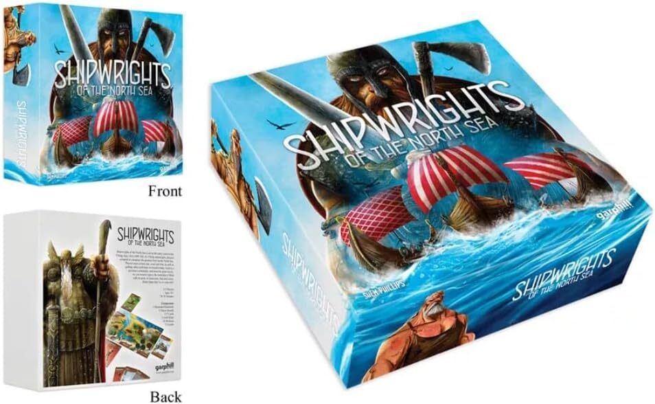Shipwrights of the North Sea is set in the early years of the Viking Age, circa 900 AD. As Viking shipwrights, players compete to build the greatest fleet on the North Sea. Players must collect oak, wool and iron, as well as getting other craftsmen on board to help. Gold is a precious commodity, and must be spent wisely. As you would expect, the township is filled with an array of characters, bad and worse. Better hope they're on your side! The aim of Shipwrights of the North Sea is to be the player with the most Victory Points at the game s end. Points are gained by constructing various Ships and Buildings. The game ends after the round where 1 or more players constructs their 4th ship. Contents Summary: 128 Cards 5 Player Boards 5 Player Reference Boards 1 Pioneer Token 5 VP Markers 5 Gold Ship Tokens 25 Oak Tokens 25 Wool Tokens 25 Iron Tokens 50 Workers Tokens 5 Shields (Townsfolk Expansion) 1 Townsfolk Board (Townsfolk Expansion)1 Rulebook.50-75 minutes, Ages 10+, 2-5 players. A Game by Shem Phillips.