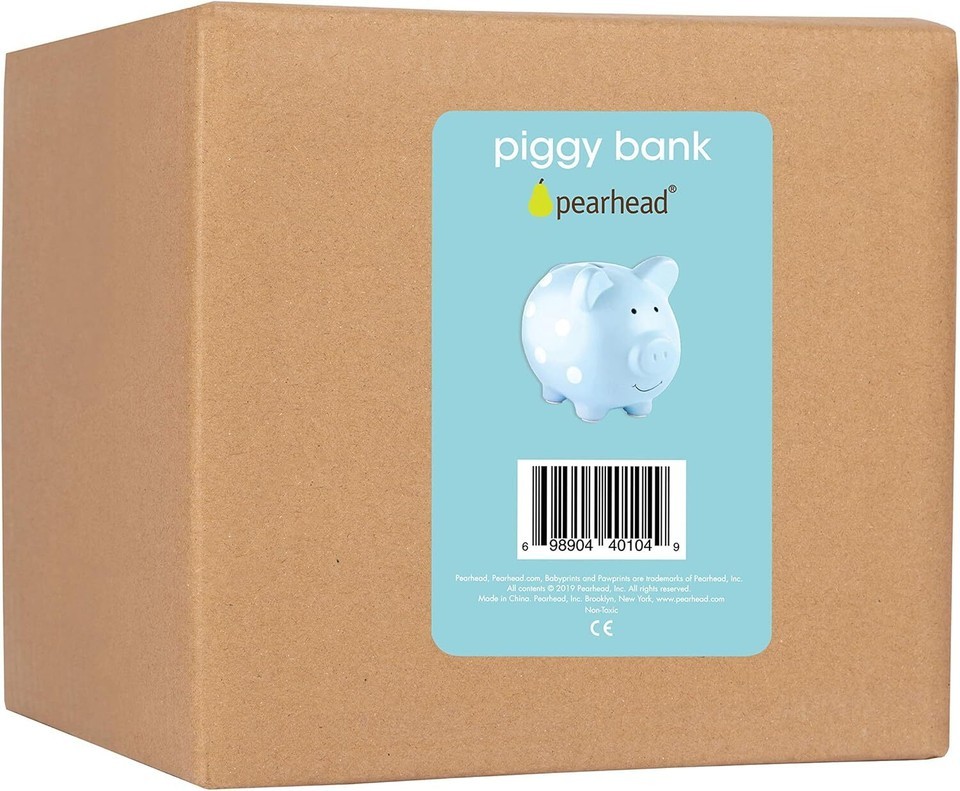 This Pearhead piggy bank didn't go to the market. He's right at home with you, making sure your little ones are starting to save early! Kids will love placing money in their new piggy bank friend and watching their savings grow. This large sized ceramic pastel colored bank is decorated in a white polka dot design. The durable ceramic bank is the perfect nursery decoration for any baby nursery room or kid?s bedroom. This adorable little bank sits on any table or bookshelf with soft felt feet to protect any surface. It has a rubber stopper holding in all your coins. When your little one needs to open the bank, the rubber stopper is easy to remove. Thinking of baby registry ideas? This bank also makes for a great baby shower gift! This special baby keepsake will be treasured for years to come. At Pearhead, we aim to create genuine, quality products to celebrate your special moments in life. We are a family of designers, marketers, and trendsetters bringing products to life that will bring a smile to your face. From concept and design to production and customer service, the Pearhead team works together seamlessly every step of the way. Whether your baby is celebrating their first year of life, you are announcing your pregnancy, or your pup is celebrating his first holiday season, Pearhead is here to share your moments in style. Money Bank Dimensions: 5.55? W x 6.5? H x 6.5? D