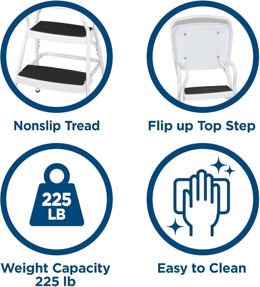 FLIP-UP SEAT - Seat quickly flips up to transform chair into a step stool
