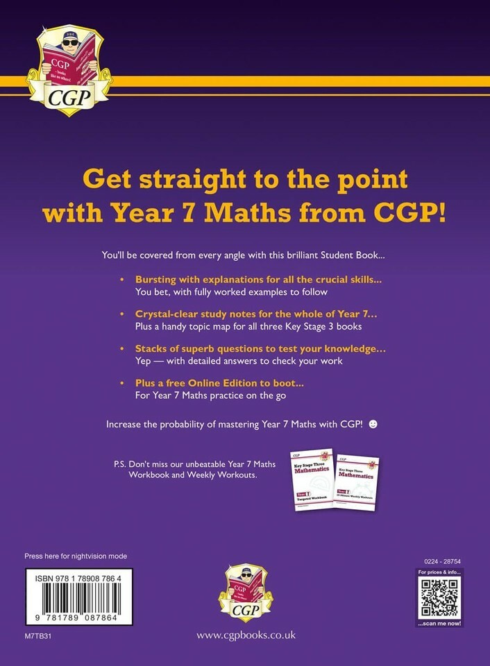 Fully updated to match the latest curriculum, this CGP KS3 Maths book is the perfect resource for Year 7 students looking to boost their skills and confidence in mathematics. It includes comprehensive explanations, practice questions, full answers, and online access for extra revision support.