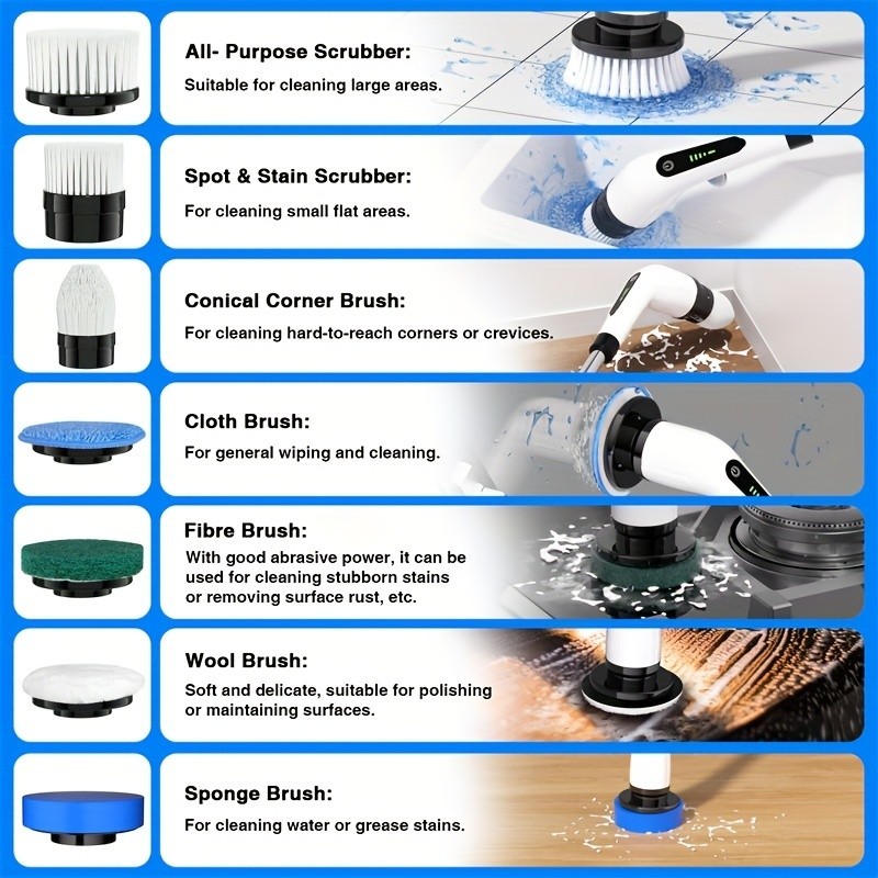 7 Replaceable Brush Heads: Includes scrubbing, corner, cloth, fibre, sponge, wool stain brushes.