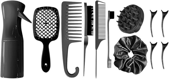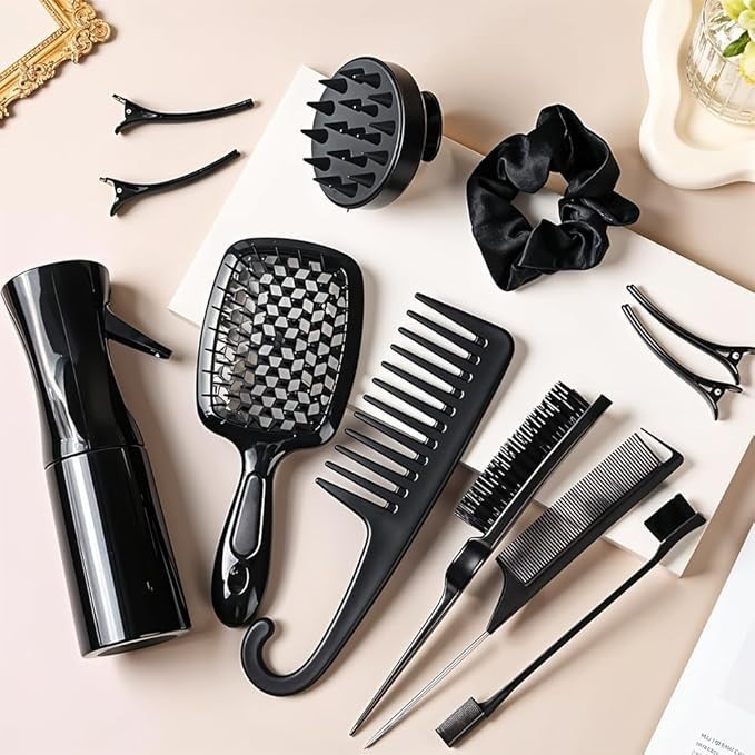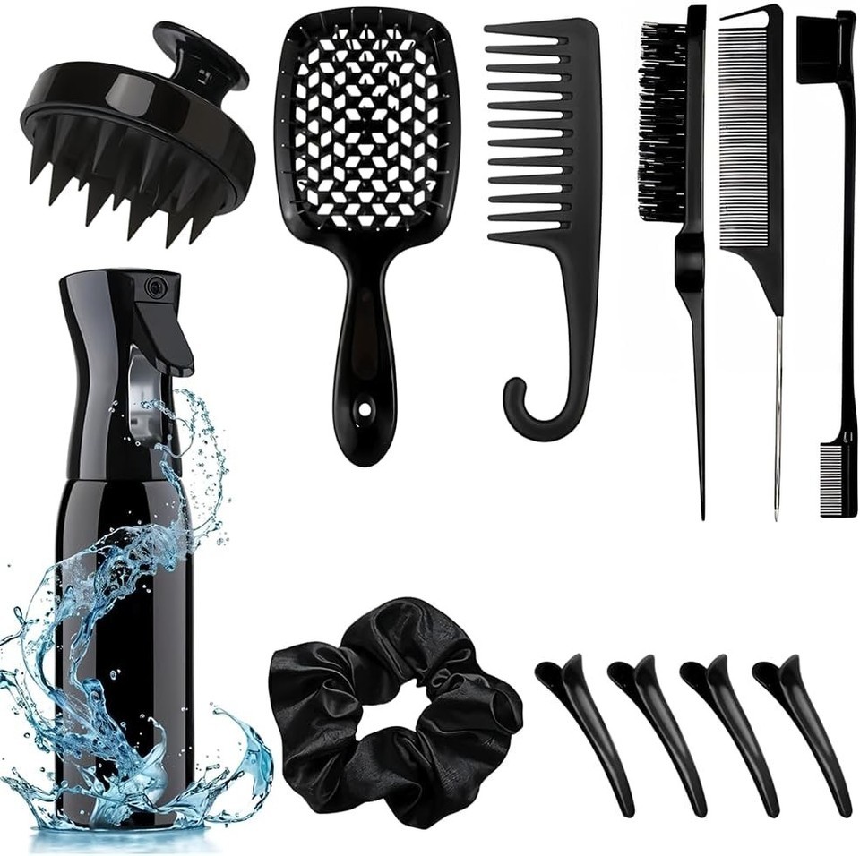 12Pcs Hair Comb Detangling Brush Set for Women | Curly Hair Styling Kit with Spray Bottle Sectioning Clips | Professional Salon Hair Tools - 36** (Black)