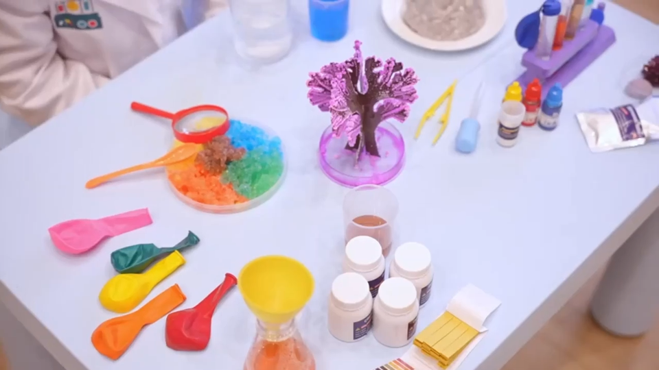 Crystal growing materials, test tubes, volcano mold, droppers, safety goggles, measuring cups, balloon set, colorful solutions, and illustrated guide ? everything needed to start your own science lab at home!