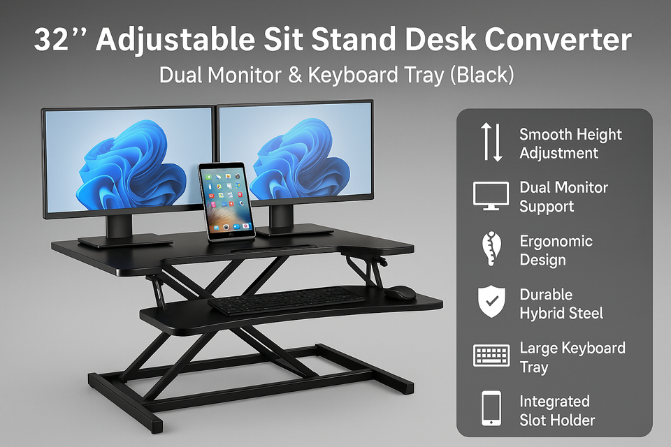 ?? 32" Adjustable Sit Stand Desk Converter ? Dual Monitor Keyboard Tray (Black)