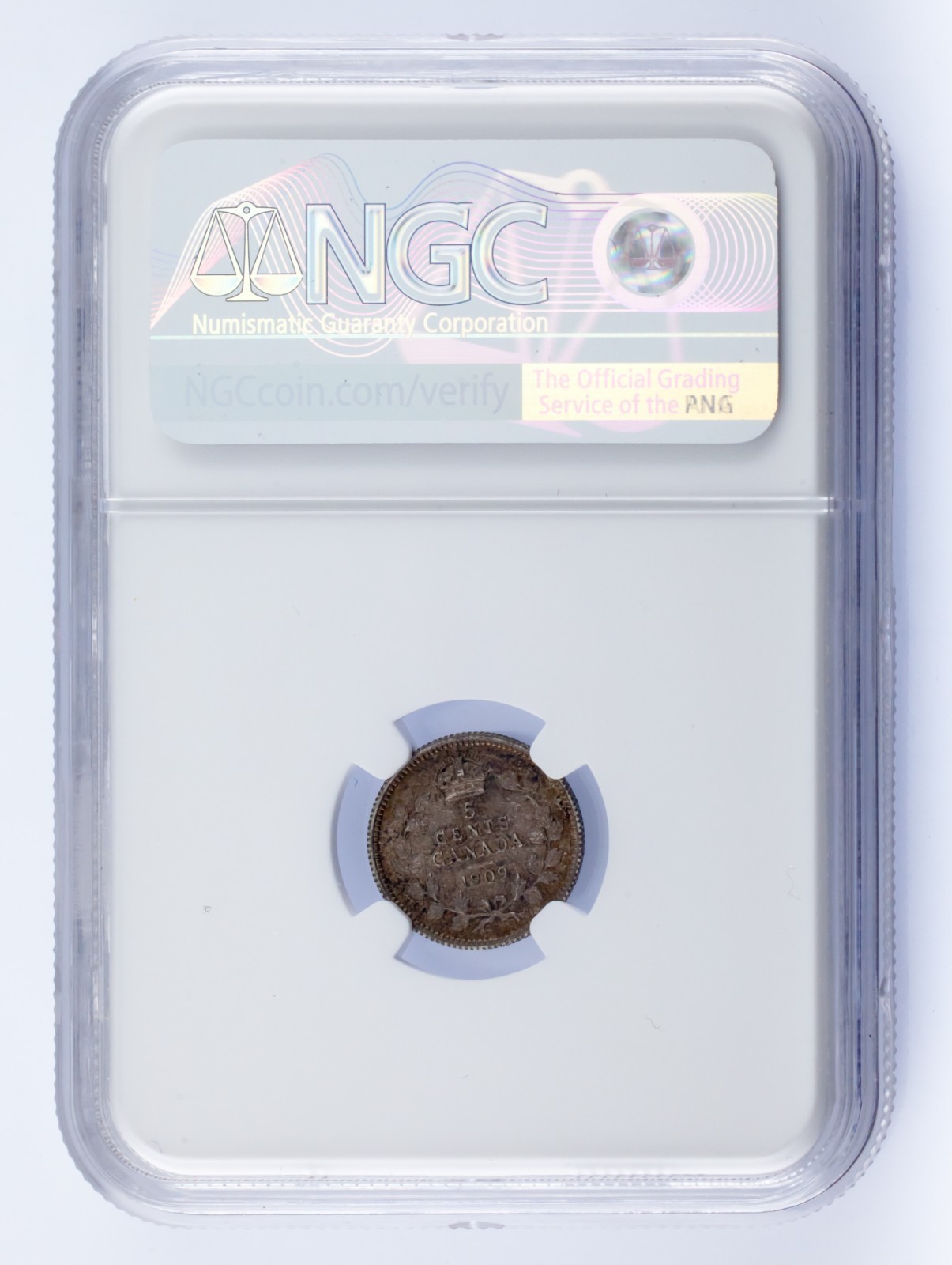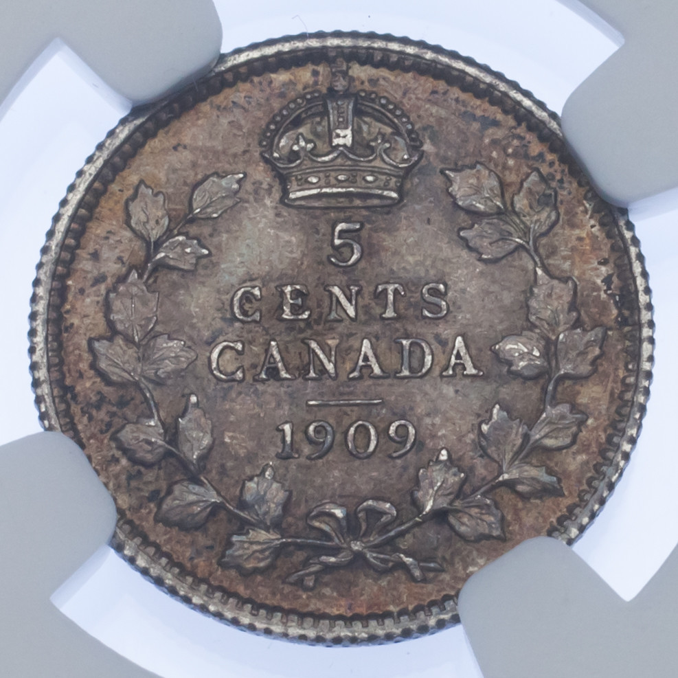 1909 Canadá 5 Centavos Hojas De Arce Lazo Cruz Calificado Por NGC Como MS62