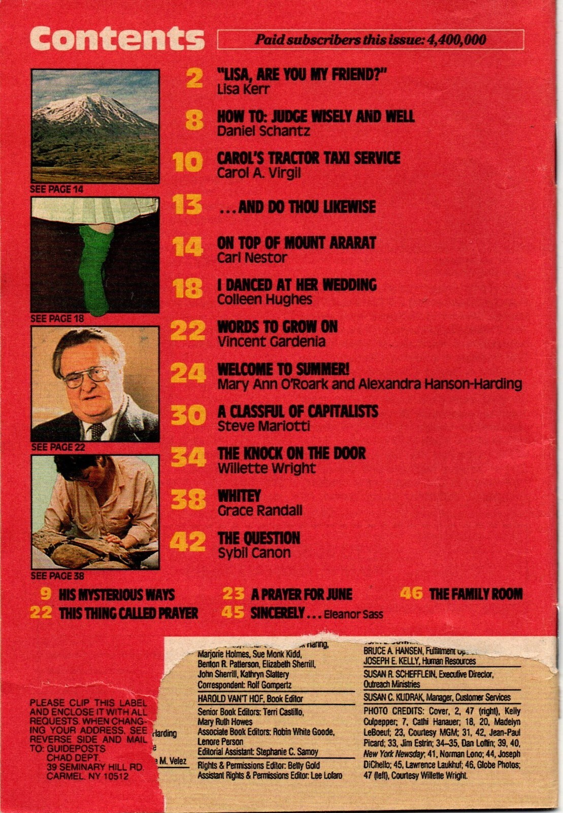 This is an original copy of Guideposts Magazine. This is the June 1989 issue. This issue features Lisa Kerr. The front cover has small piece torn out on the bottom left. The address label has been torn out of the back cover. See photos. The cover has minor shelf wear. The pages are clean. There are no missing or torn pages.