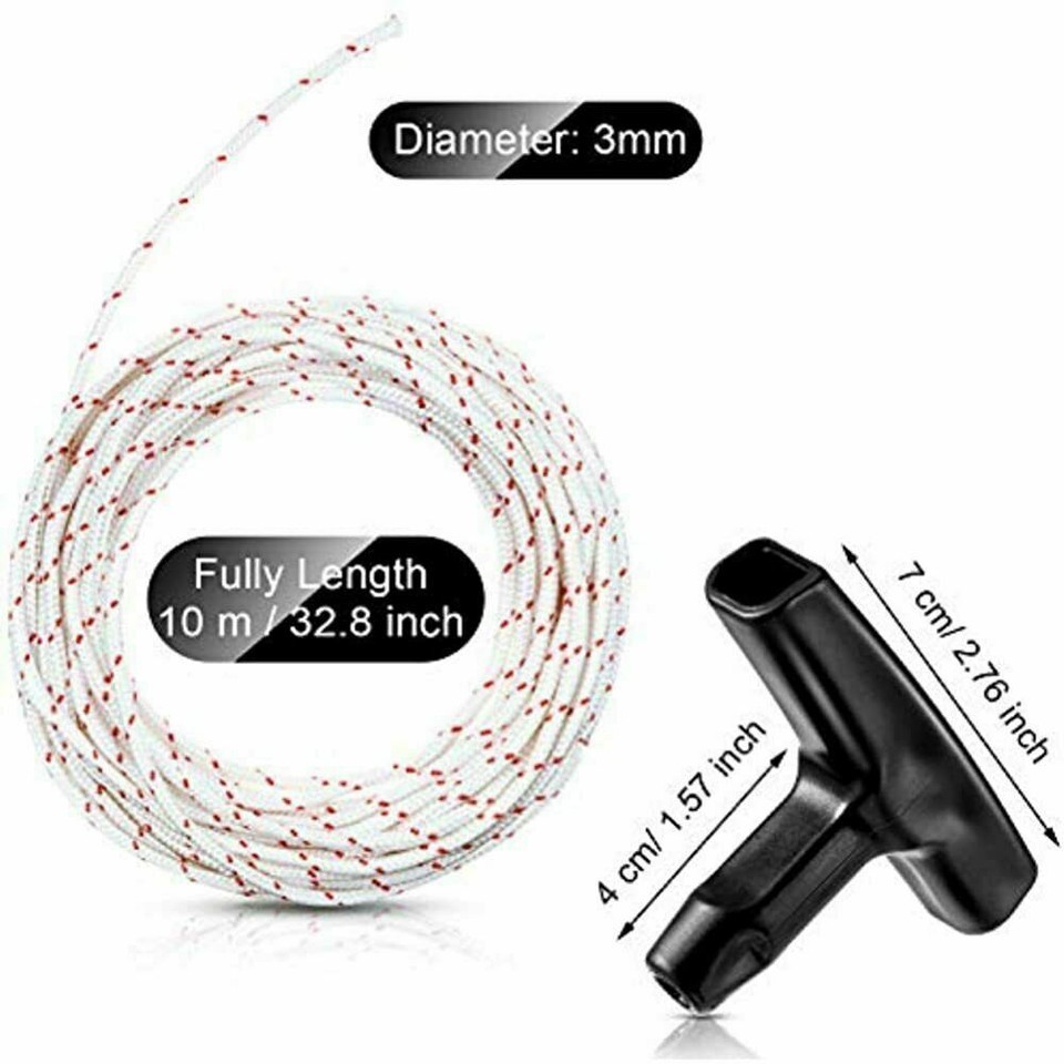 Suitable size: the recoil starter rope is 3.0 mm in diameter and 10 meter in length; The black starter handle is 7 cm in length for each
