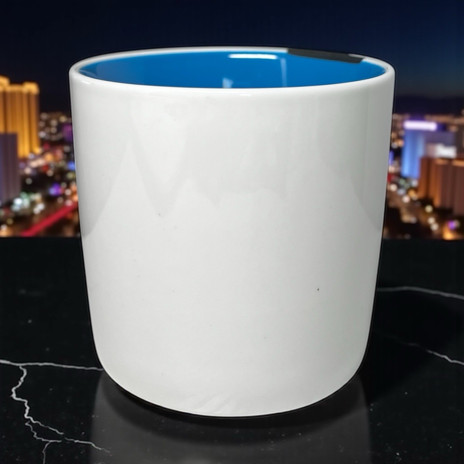 This striking 14oz ceramic coffee cup features a bold black geometric star pattern with ?Las Vegas? scripted across the front, set against a bright blue interior that pops with energy ? just like the city itself.