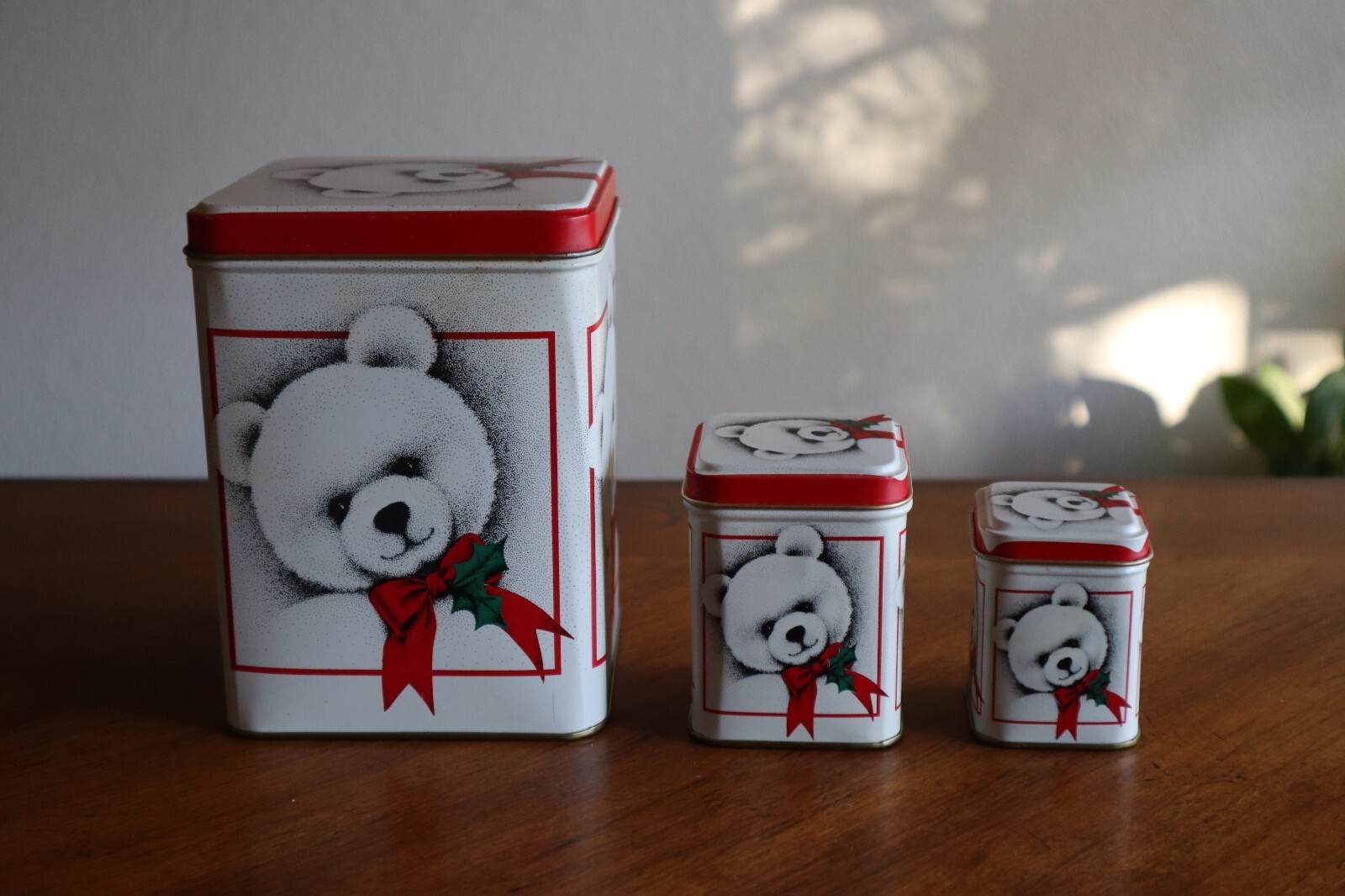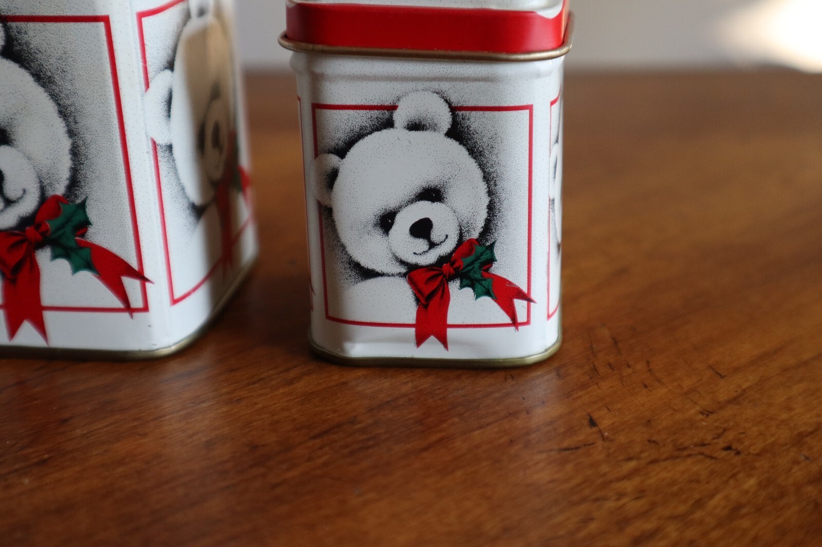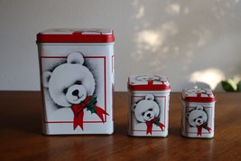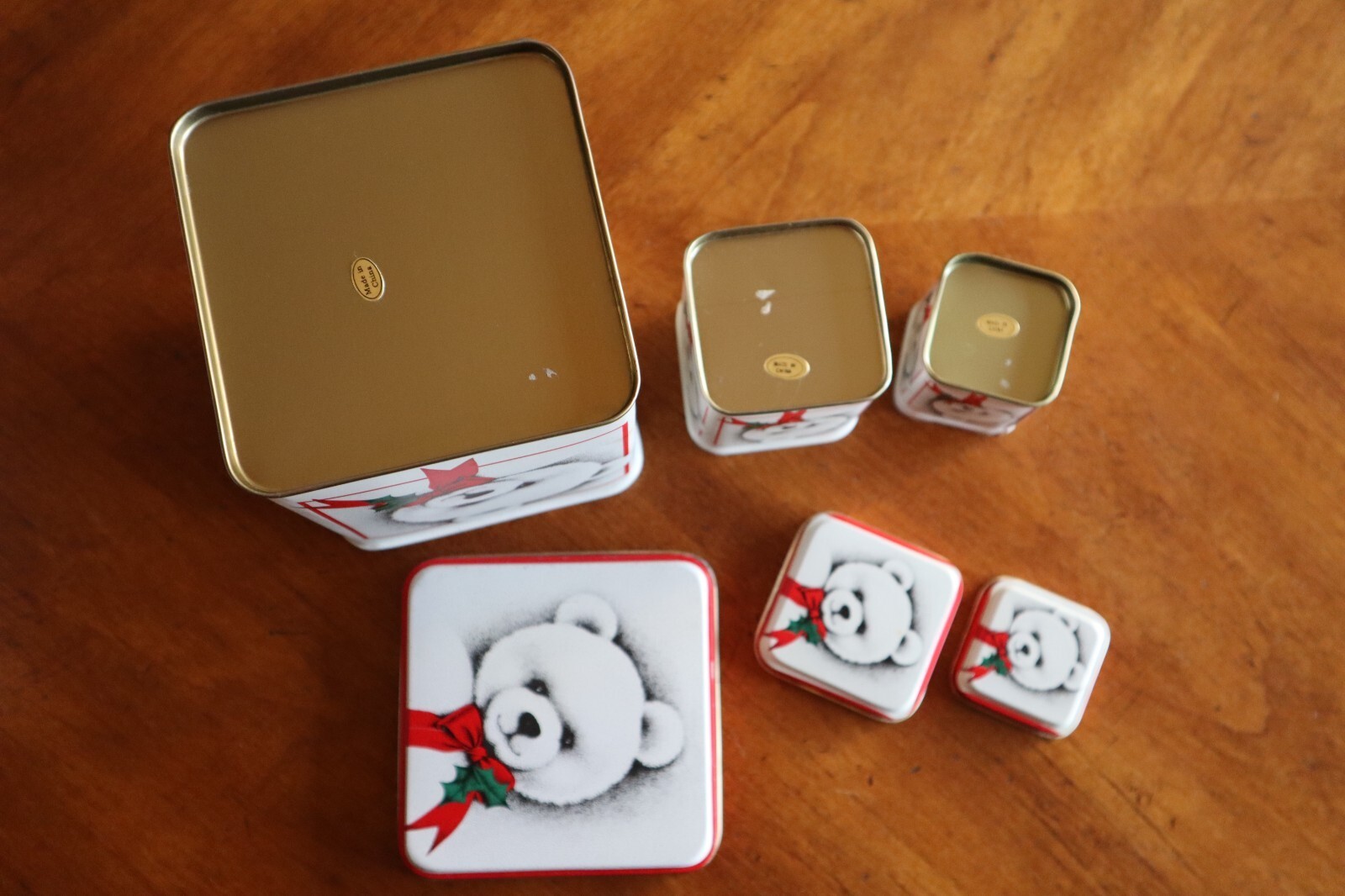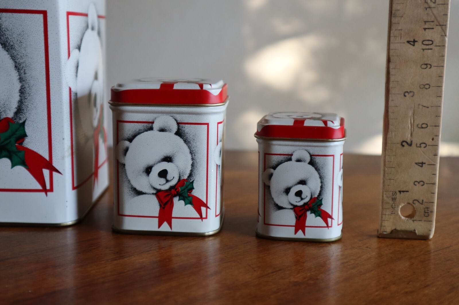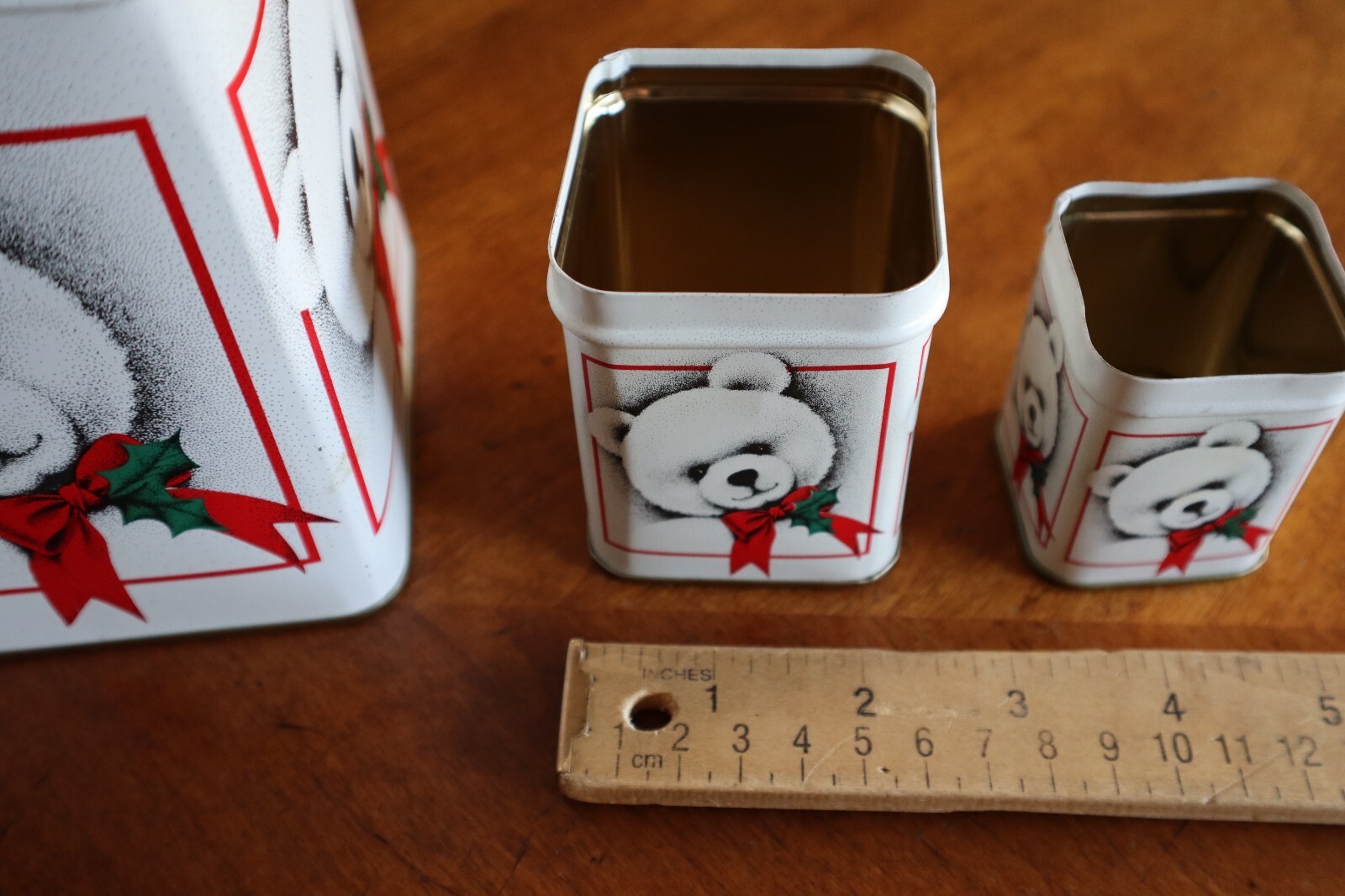 3x Vintage White Polar Bear Red Bow Holly Nesting Christmas Tin Box 5.75"-2.5"