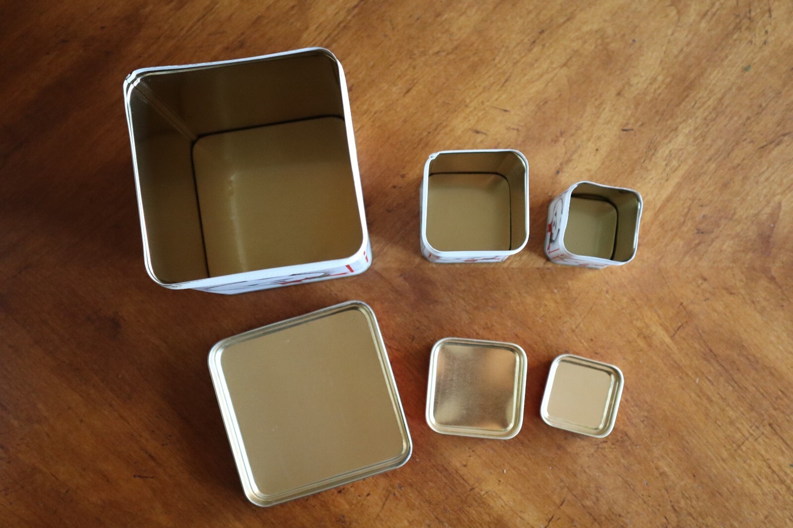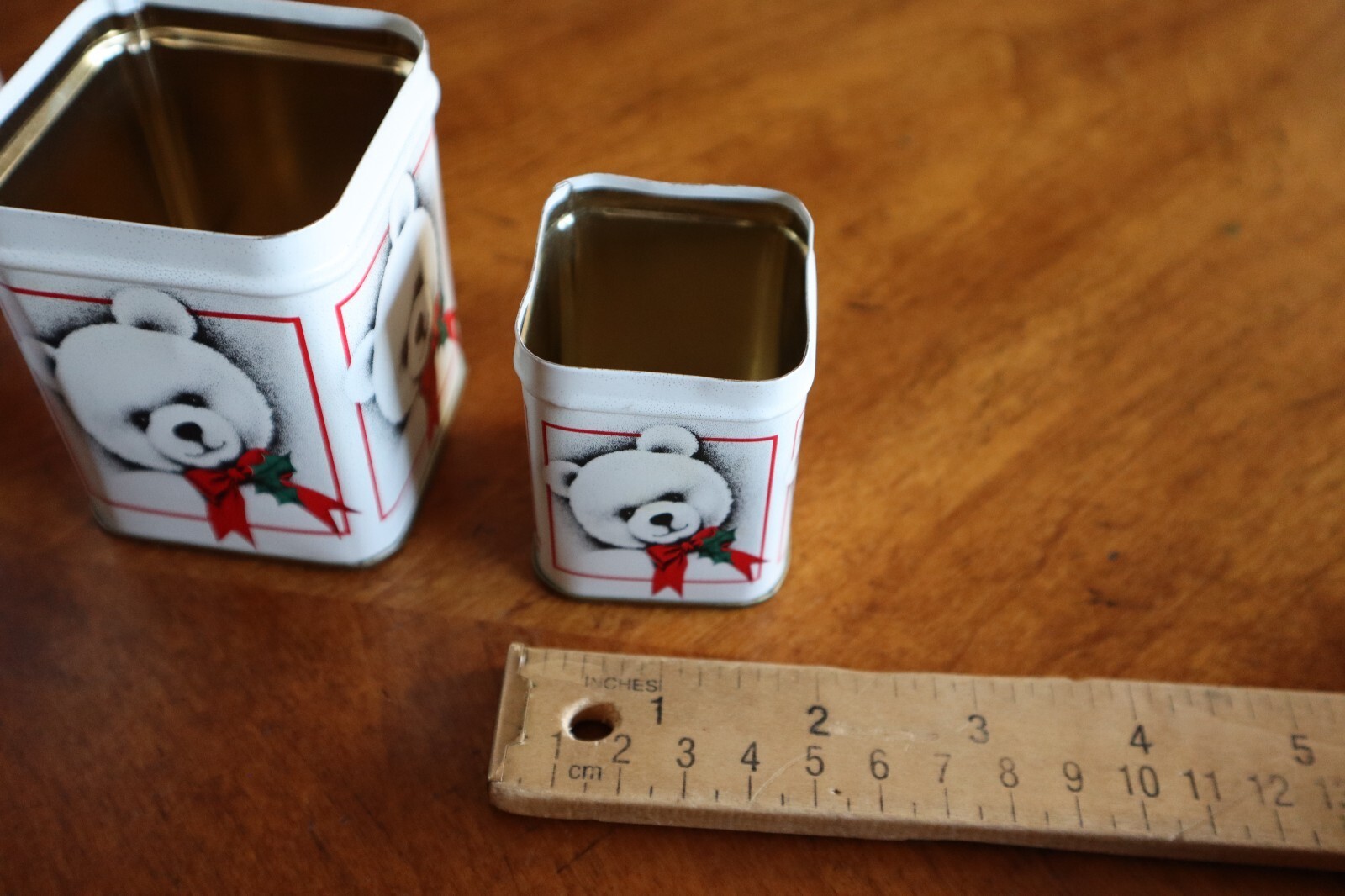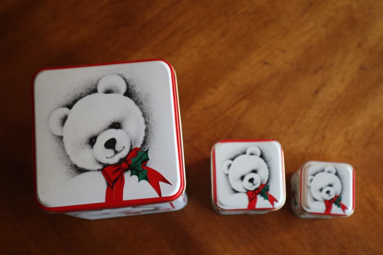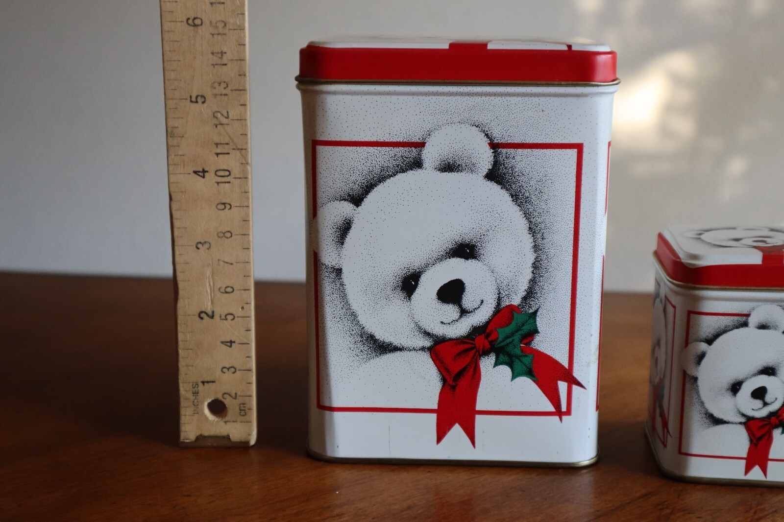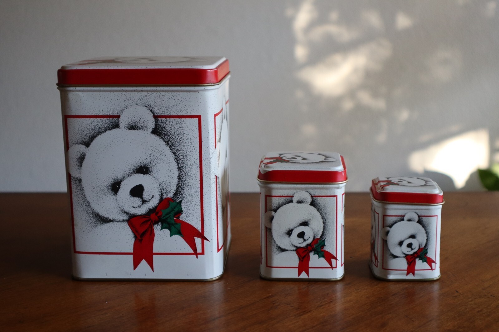 3x Vintage White Polar Bear Red Bow Holly Nesting Christmas Tin Box 5.75"-2.5"