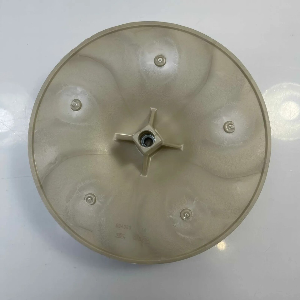 The blower wheel attaches to the motor shaft using left-handed threads and can be removed by unscrewing it clockwise off the motor shaft. It is particularly suitable for 29-inch models with a lint filter on top. This part is compatible with select Whirlpool brand models including Kenmore, and Roper.