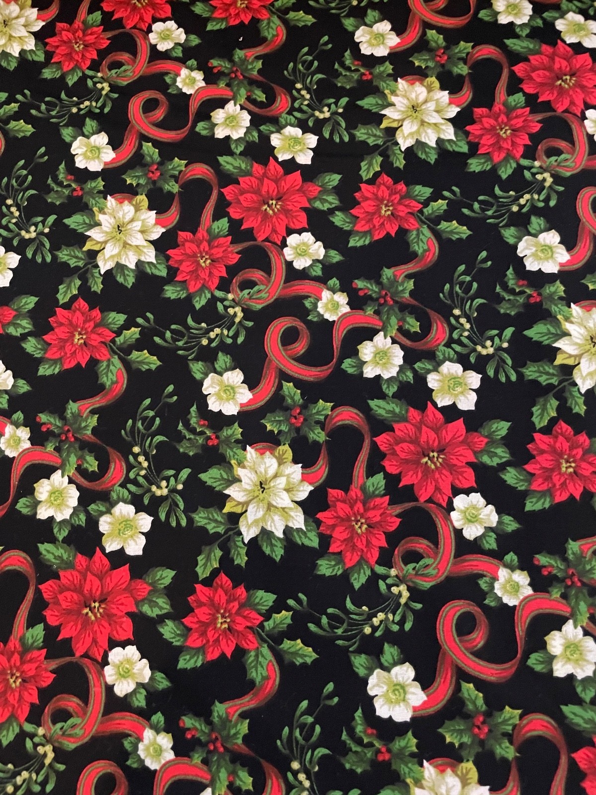 Santee Prints presents Poinsettia and Holly on a black background. 100% premium Cotton fabric