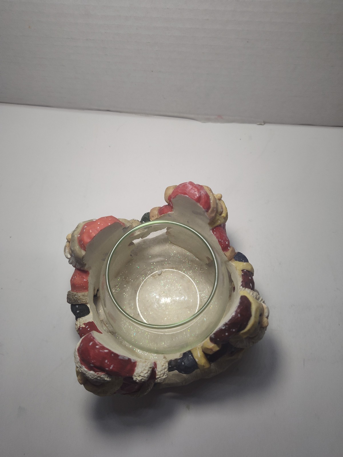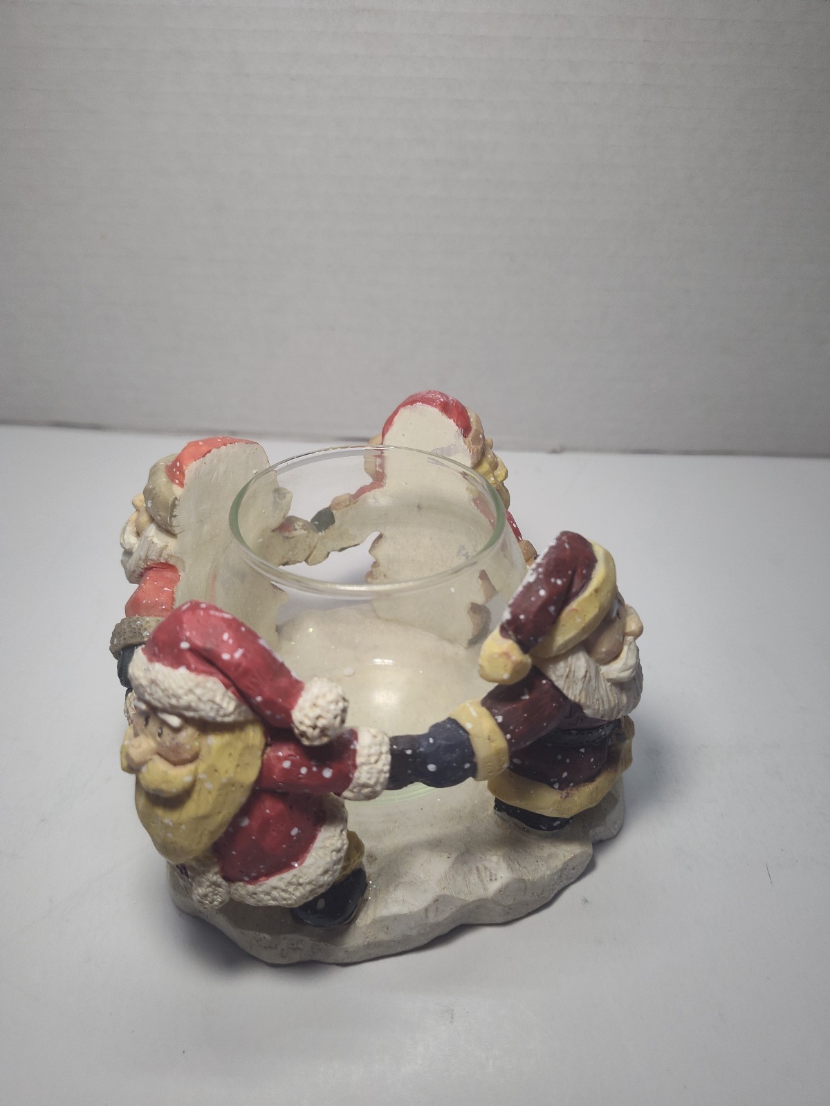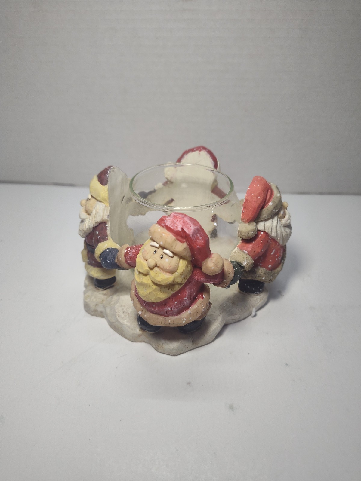 Vintage Christmas Fantasy Ltd candle holder featuring four Santa Claus figures surrounding a glass candle insert. Each Santa is uniquely detailed and hand-painted in festive colors. Made of durable resin with a 3-D sculpted design about 2 inches thick, perfect as a table centerpiece or holiday mantel decoration.