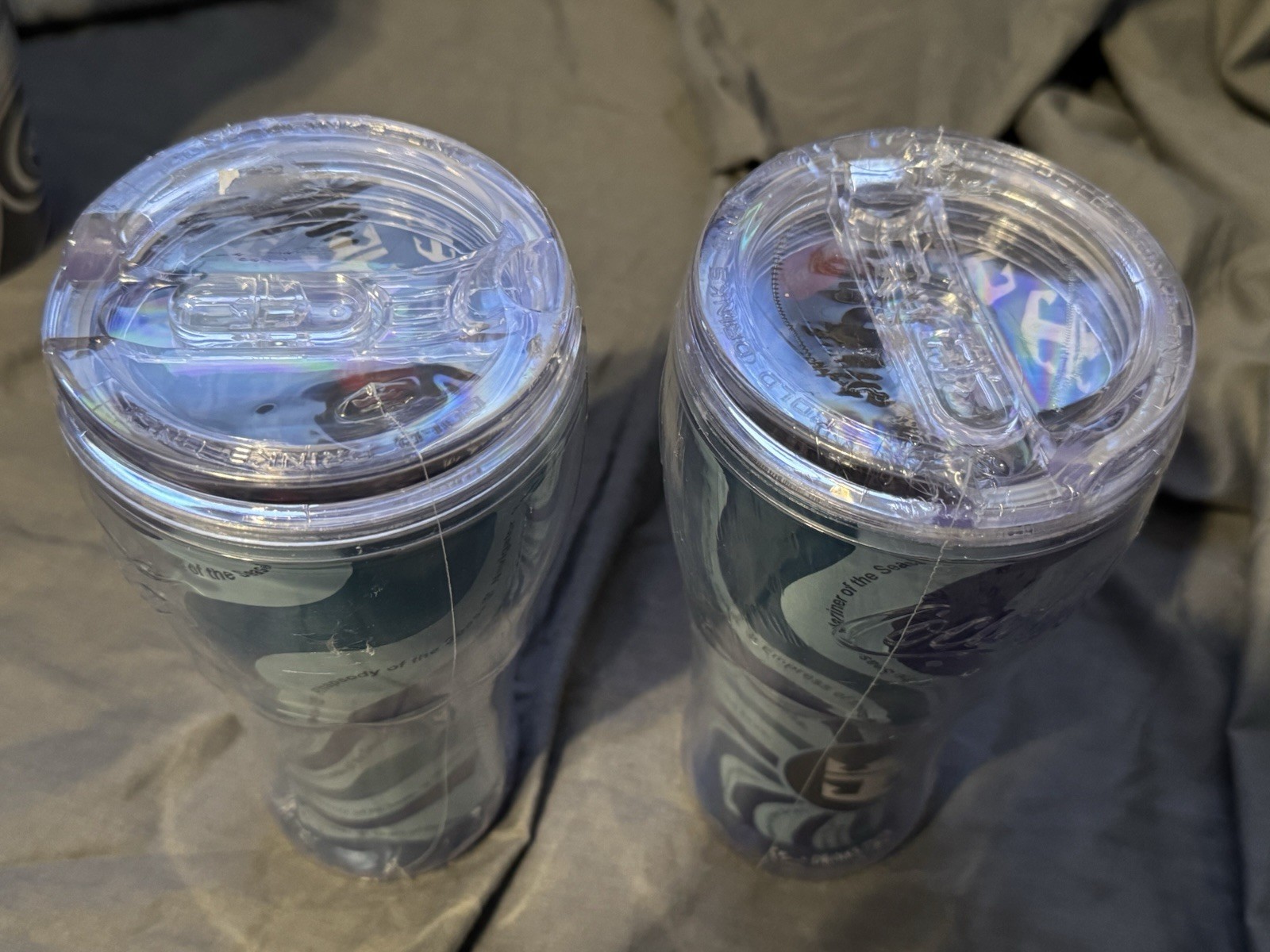 ? (3) Brand New Sealed tumblers (blue wave design with ship names)