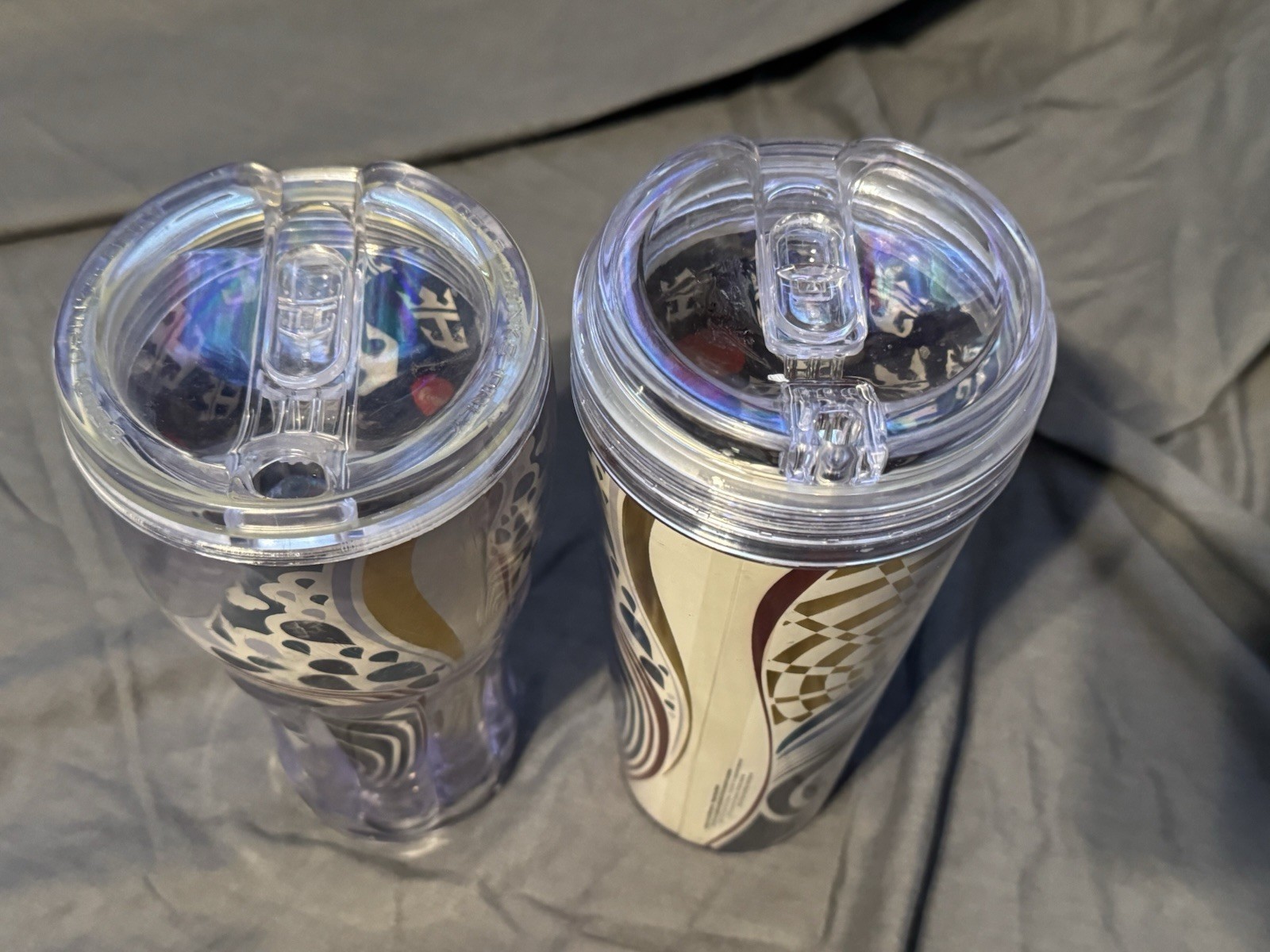 ? (2) Lightly Used tumblers (multicolor wave design) ? clean, clear, and in excellent like-new condition