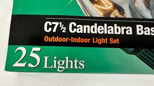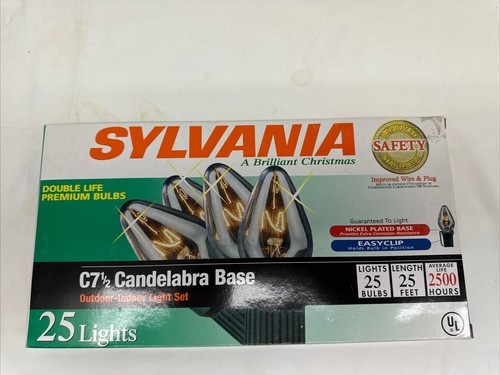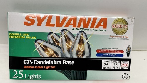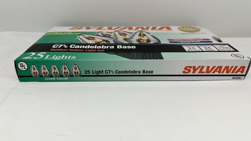 Old new stock Add a touch of holiday magic to your home with this Sylvania A brilliant Christmas C7 Candelabra. The candelabra features 25 clear bulbs that will sparkle and shine like real diamonds. The green cord adds a festive touch to the overall design. Perfect for Christmas occasions, this string light is sure to impress your guests and create a warm, cozy atmosphere.