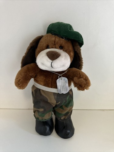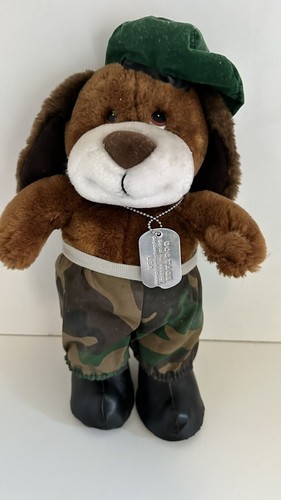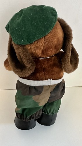 This vintage KB Toy dog tag is a unique addition to any stuffed animal collection. With its brown plush toy camo camouflage pants and boots, it is sure to stand out. The medium size (14-24 in) makes it the perfect size for cuddling and playtime.