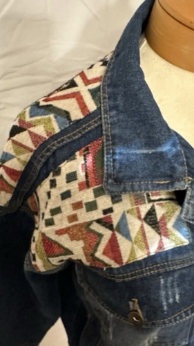 This unique women's denim jacket features a fascinating southwestern patchwork tapestry pattern that is sure to catch the eye. Made from a comfortable cotton blend fabric, this jacket has a classic fit and a short length, making it perfect for casual occasions, travel, or even parties and cocktails. The jacket has long sleeves and a button closure, and is available in size L.