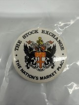The product is a 1.5" pin back button featuring "The Stock Exchange The Nations Market Place" advertising. It is a collectible item originating from the United Kingdom. The button likely served as a promotional tool for The Stock Exchange, positioning itself as a national market hub. With a classic pin back design, this item would be a nostalgic piece for those interested in vintage advertising memorabilia.