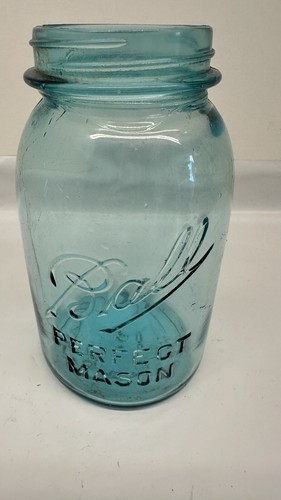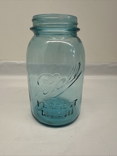 The vintage Aqua Ball Perfect Mason Quart Jar #8 is a collectible glass bottle made in the United States. The jar comes in a beautiful blue color and features a classic Ball brand emblem. It is a quart-sized jar with a traditional jar bottle type, perfect for preserving and storing goods. Please note that this particular jar does not come with a lid.