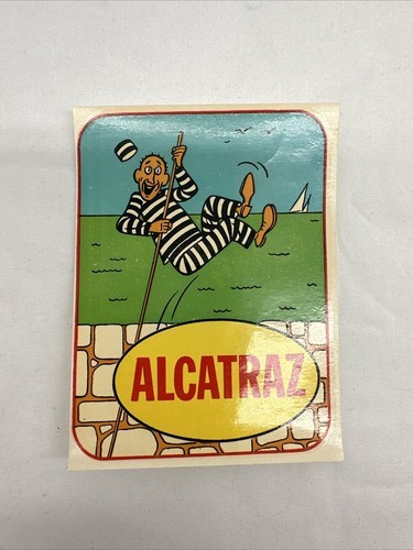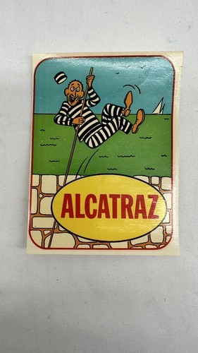 This product is a reproduction of an automobile trailer travel decal featuring Alcatraz Prison in California. The decal is multi-colored and was likely manufactured in China. It falls under the category of collectibles and advertising, specifically merchandise and memorabilia signs.