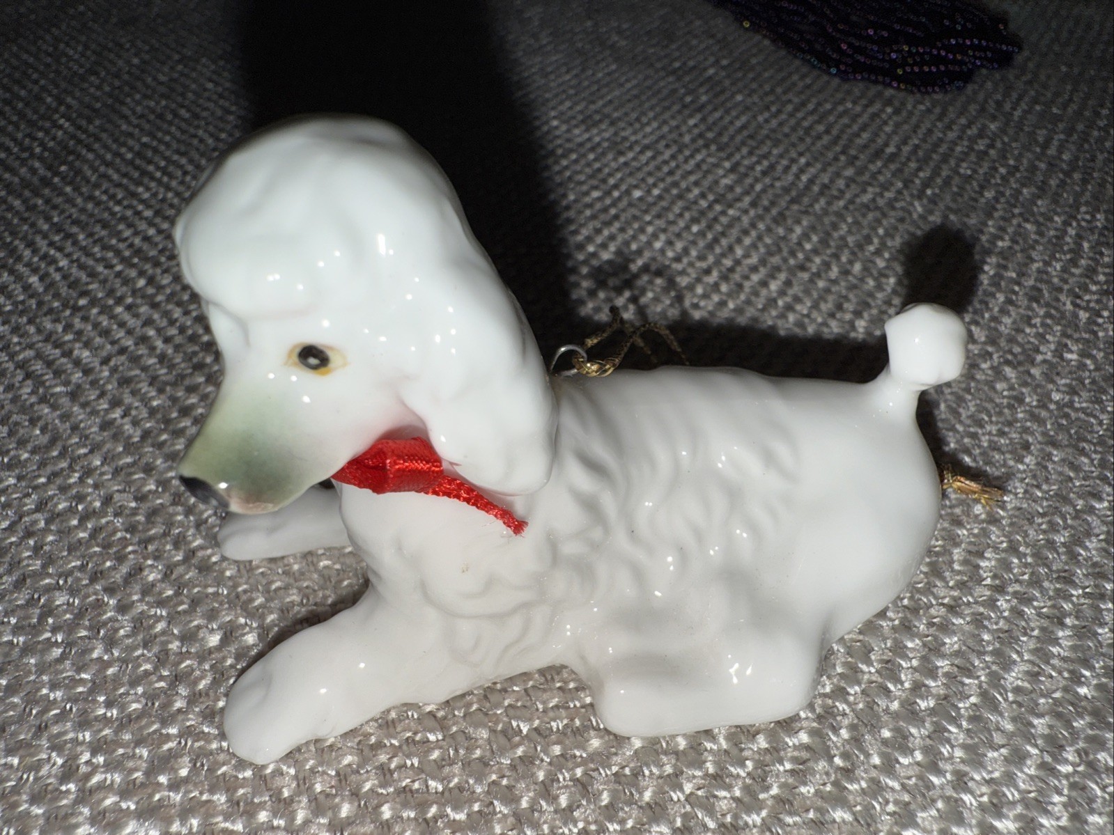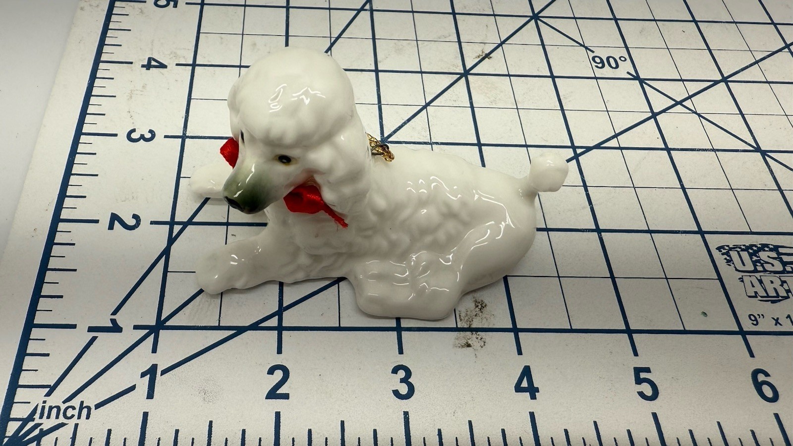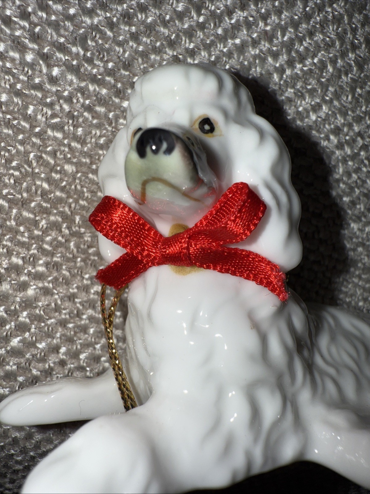 Vtg Bone China POODLE DOG Figurine 3" With Red Bow Ornament