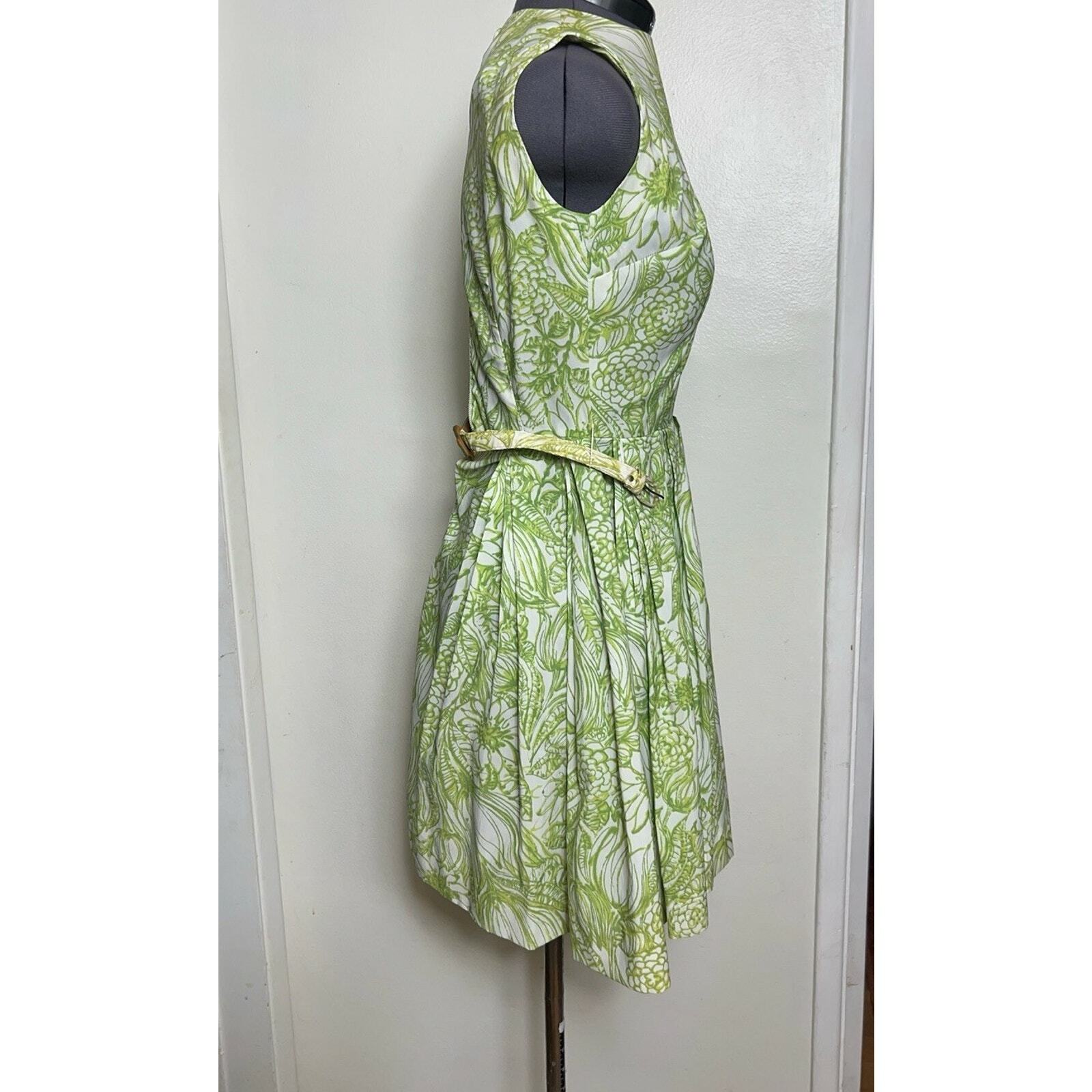 Vintage 1950s House of Nine Green White Floral Foliage Sleeveless Dress Belt XS