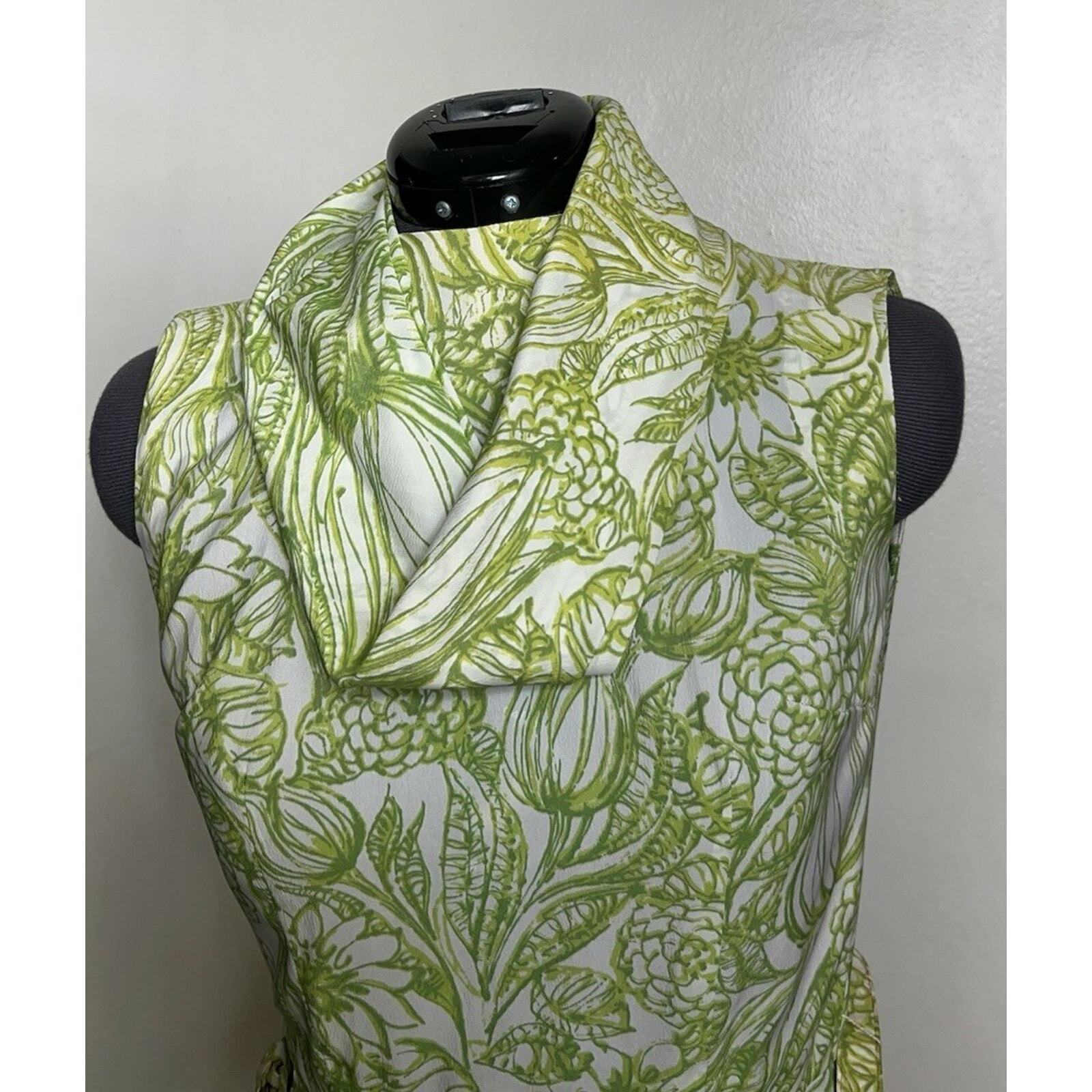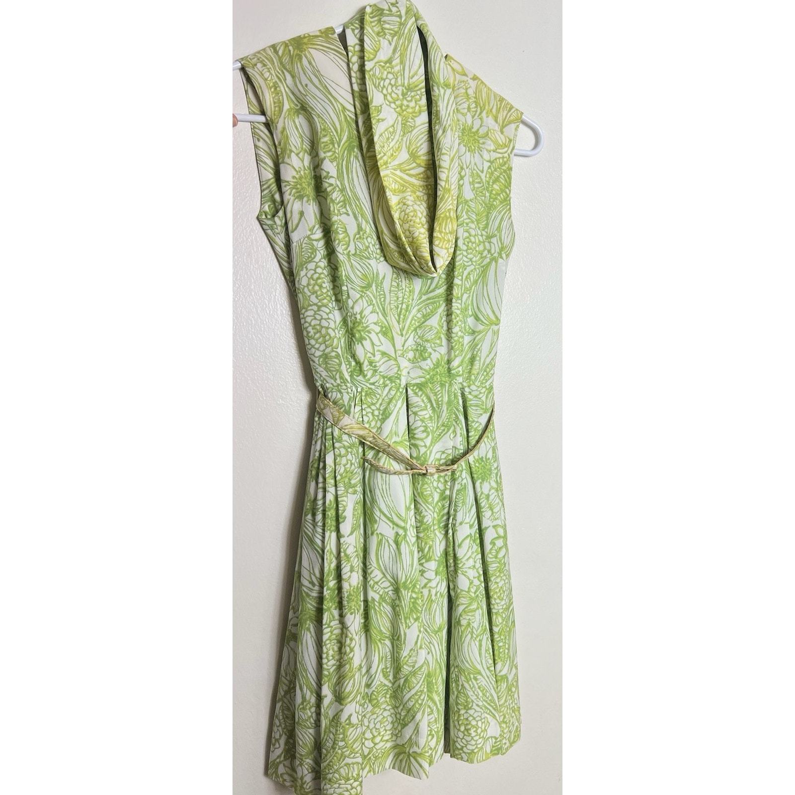 5m. Vintage 1950s House of Nine Green White Floral Foliage Sleeveless Dress w/ Belt. Belt has wear and slight discoloration on buckle. Cowl is great.